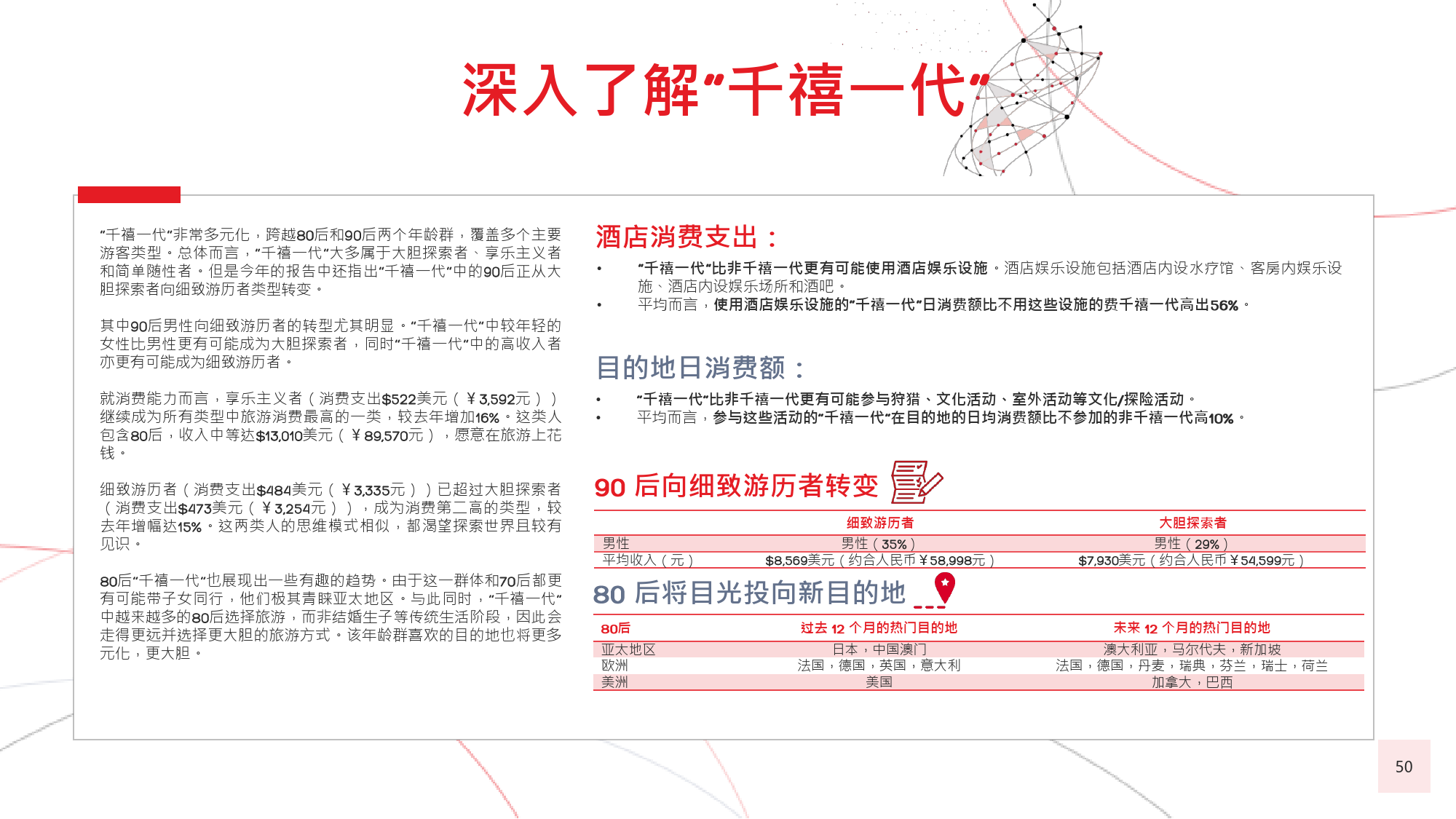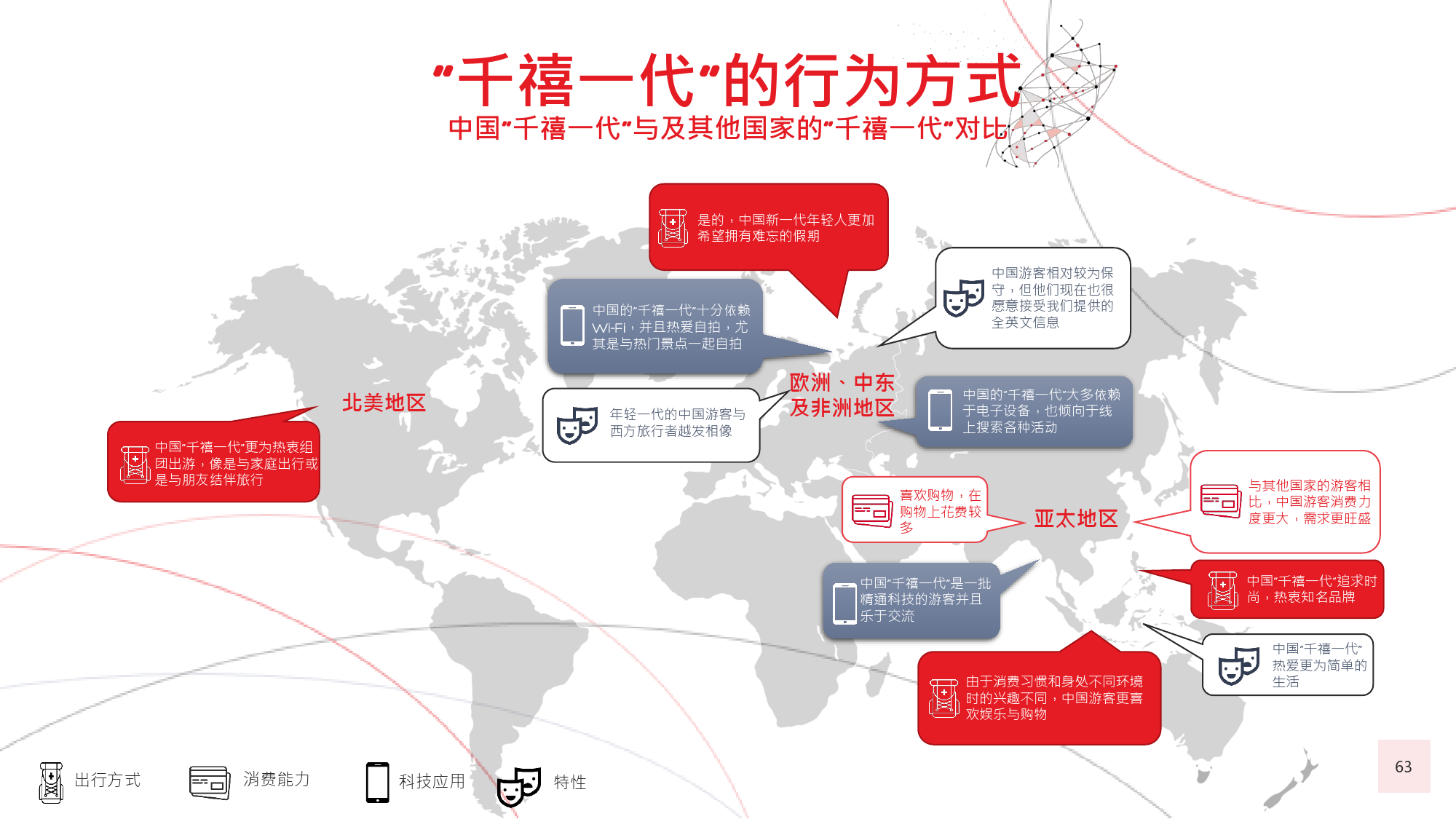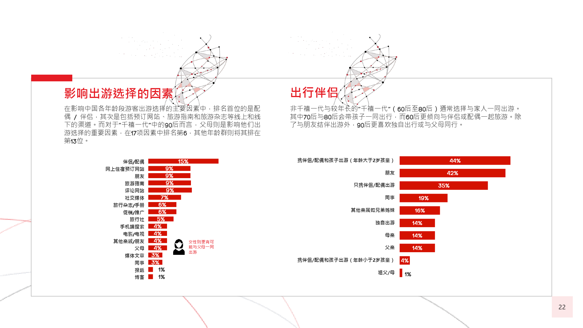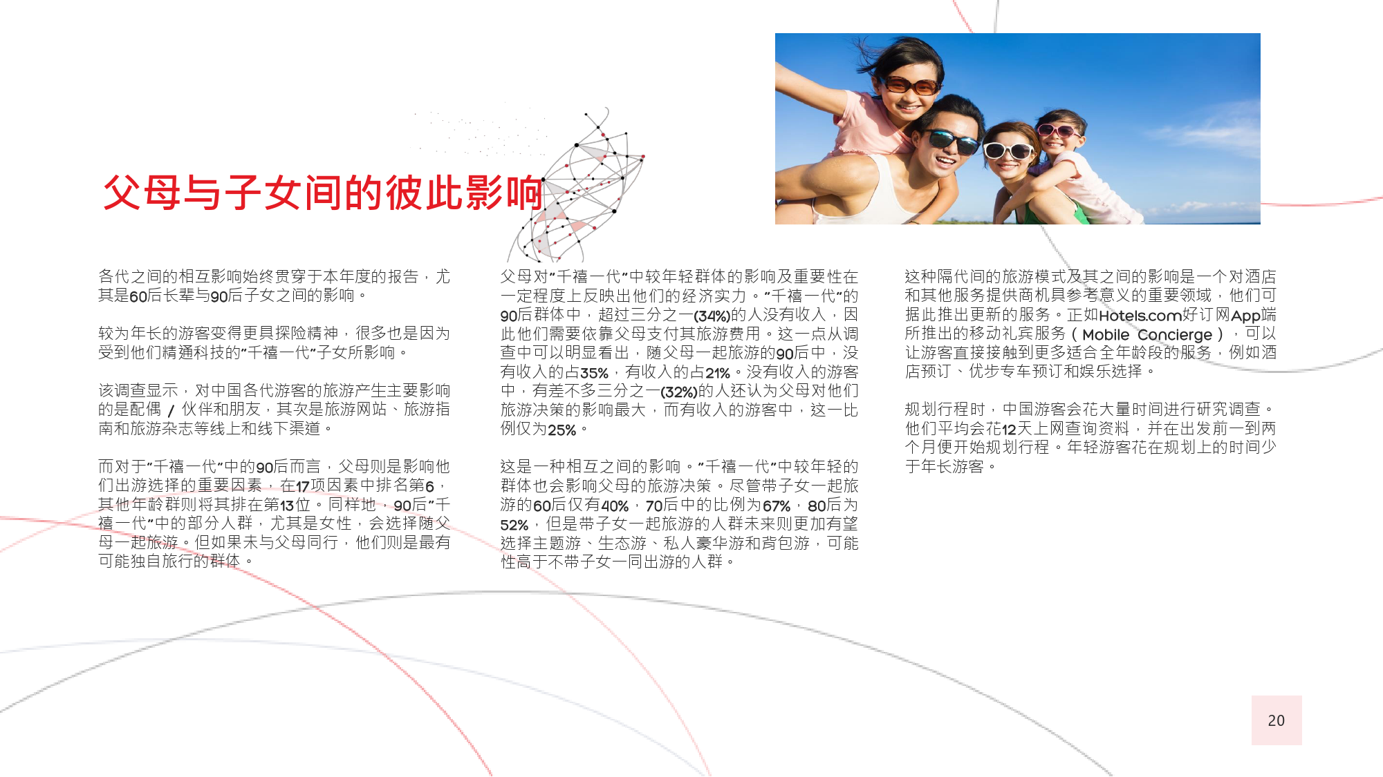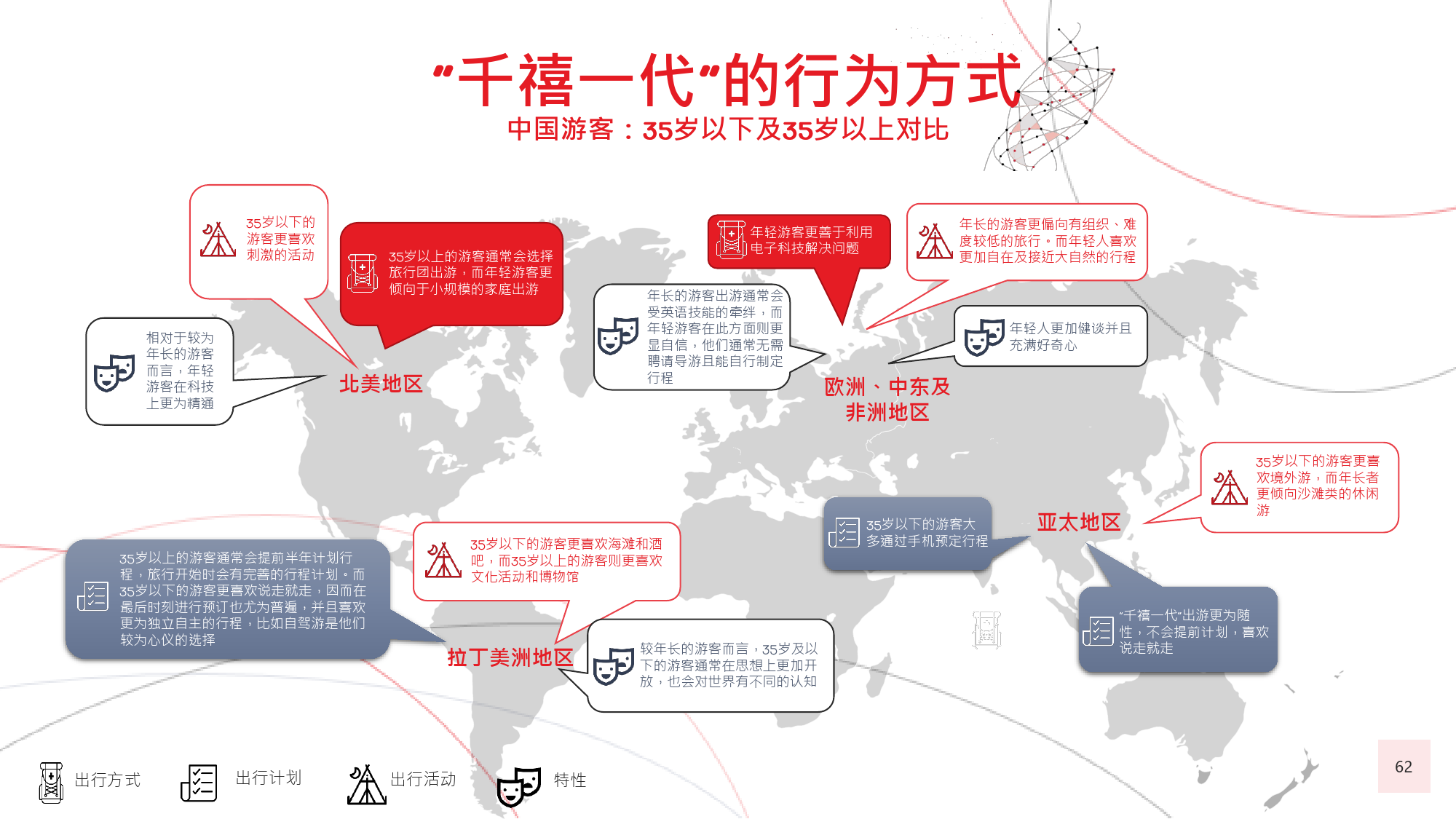 在今年的调查中,我们有个新发现,那就是在旅游偏好和 选择方面,年长游客与年轻游客间会彼此影响,尤其当60后随千禧一代子女一同出游时,该情况尤为显著。千 禧一代中的 后,尤其是还没有收入的人群受到父母的 强烈影响,这不足为奇;而让人感到意外的是,由于子女 更具冒险精神且更精通技术,反而更对 后游客群体产生强烈影响,促使他们选择更独立的国际旅行方式。