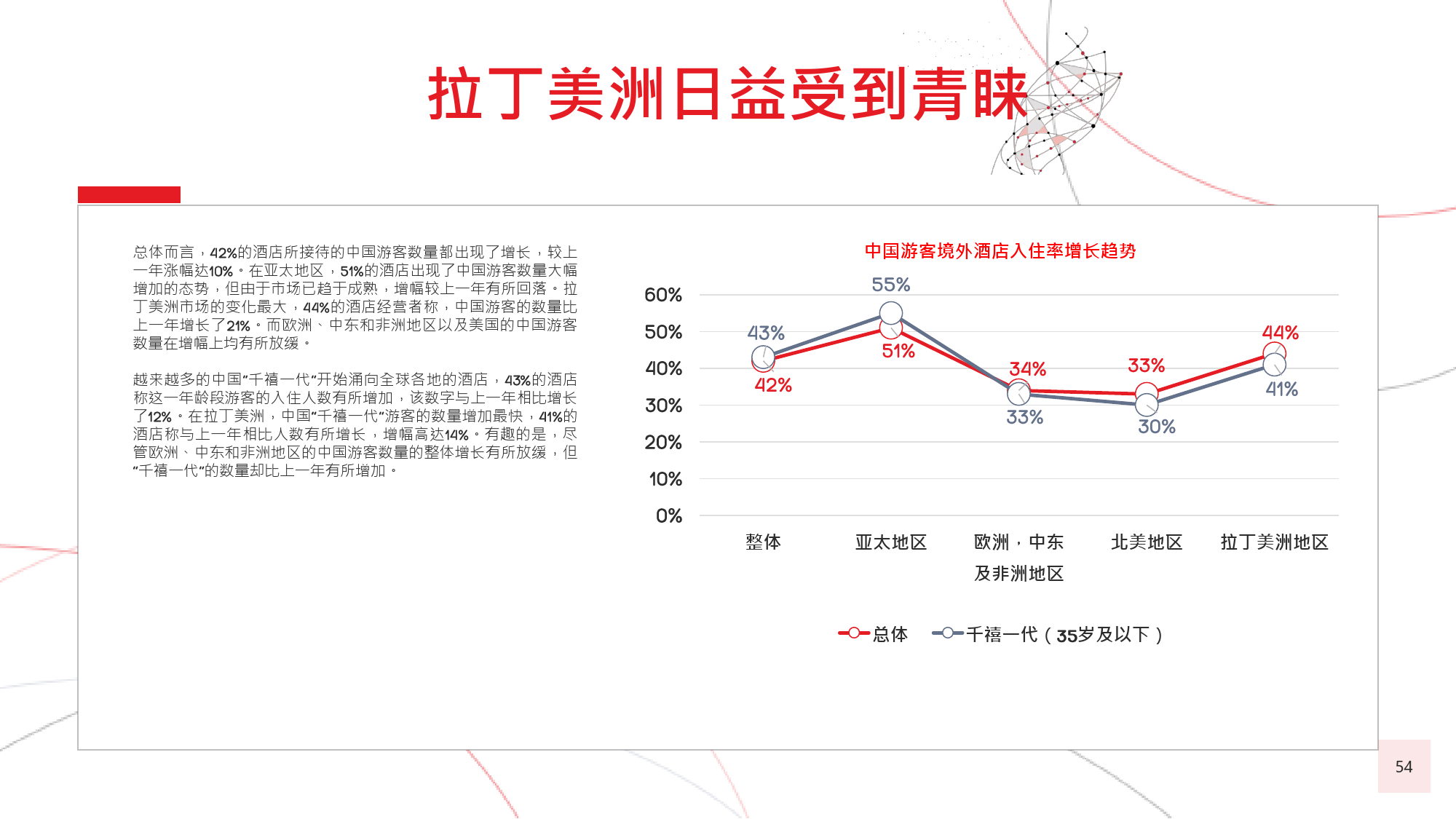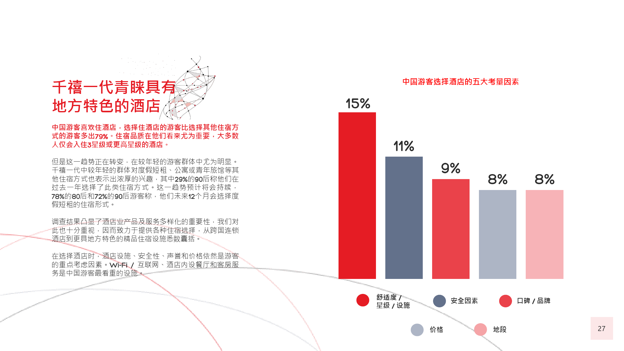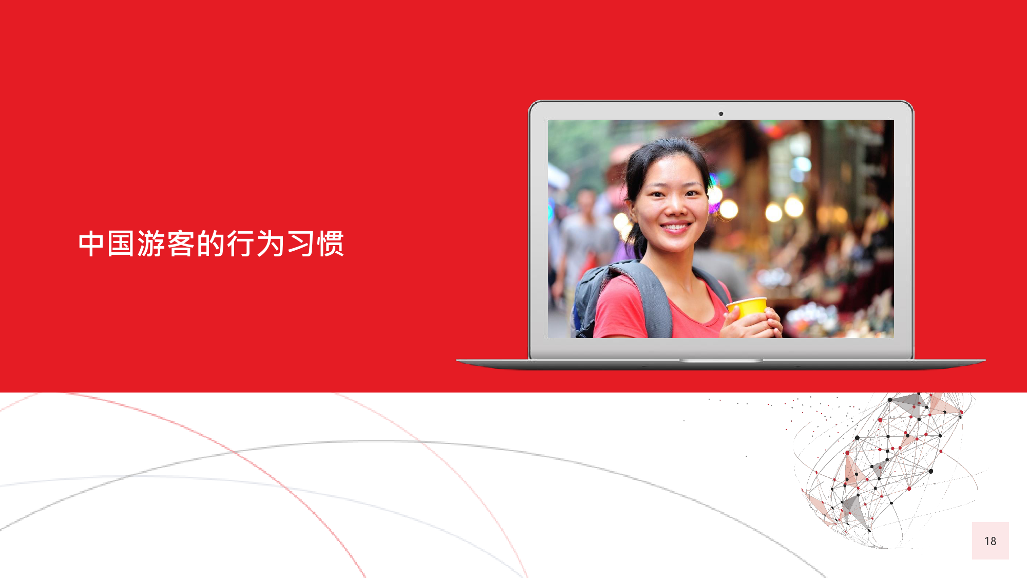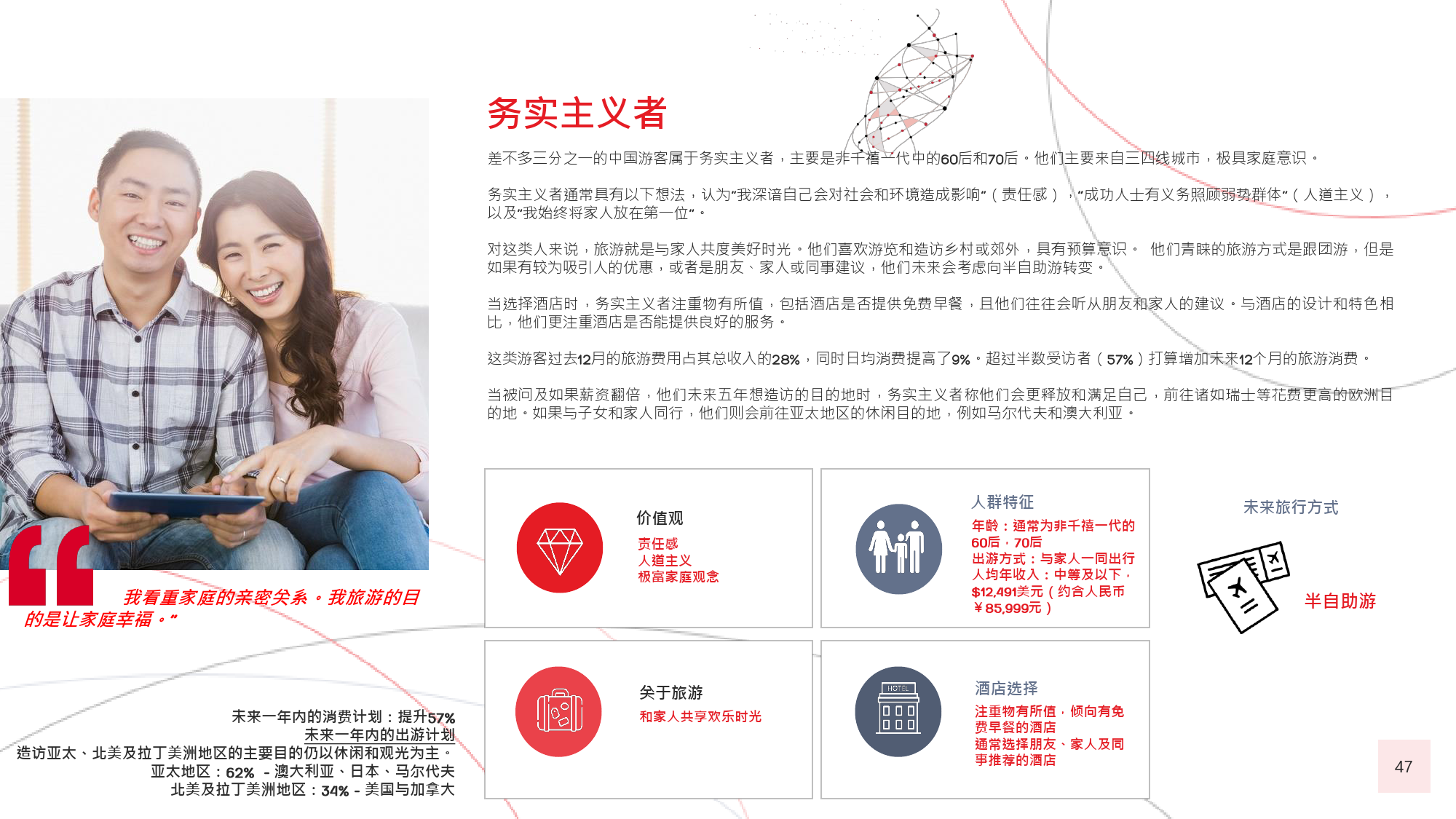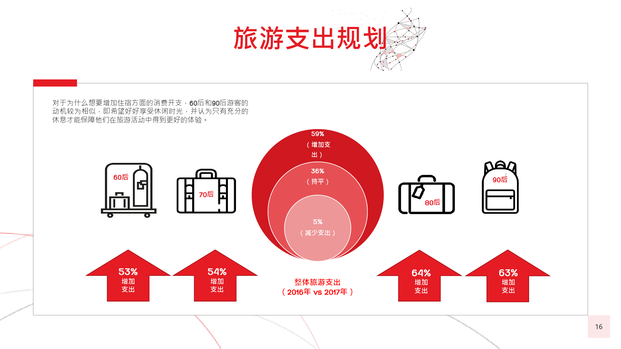 在今年的调查中,我们有个新发现,那就是在旅游偏好和 选择方面,年长游客与年轻游客间会彼此影响,尤其当60后随千禧一代子女一同出游时,该情况尤为显著。千 禧一代中的 后,尤其是还没有收入的人群受到父母的 强烈影响,这不足为奇;而让人感到意外的是,由于子女 更具冒险精神且更精通技术,反而更对 后游客群体产生强烈影响,促使他们选择更独立的国际旅行方式。