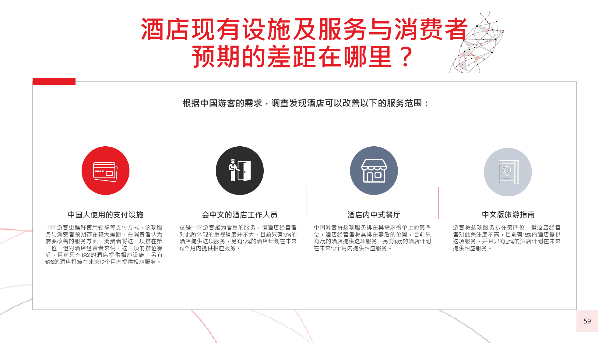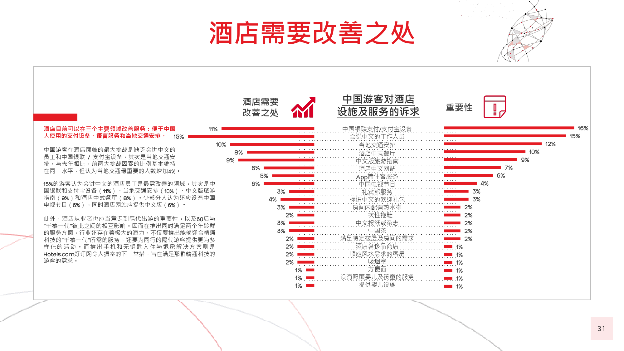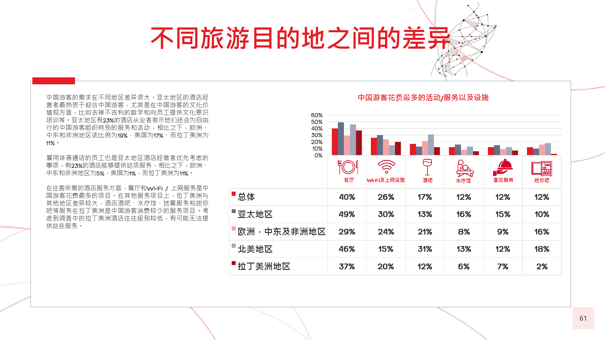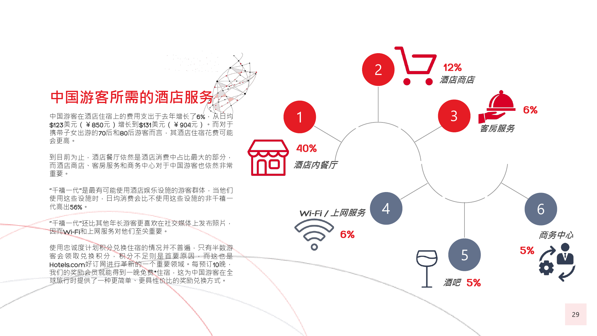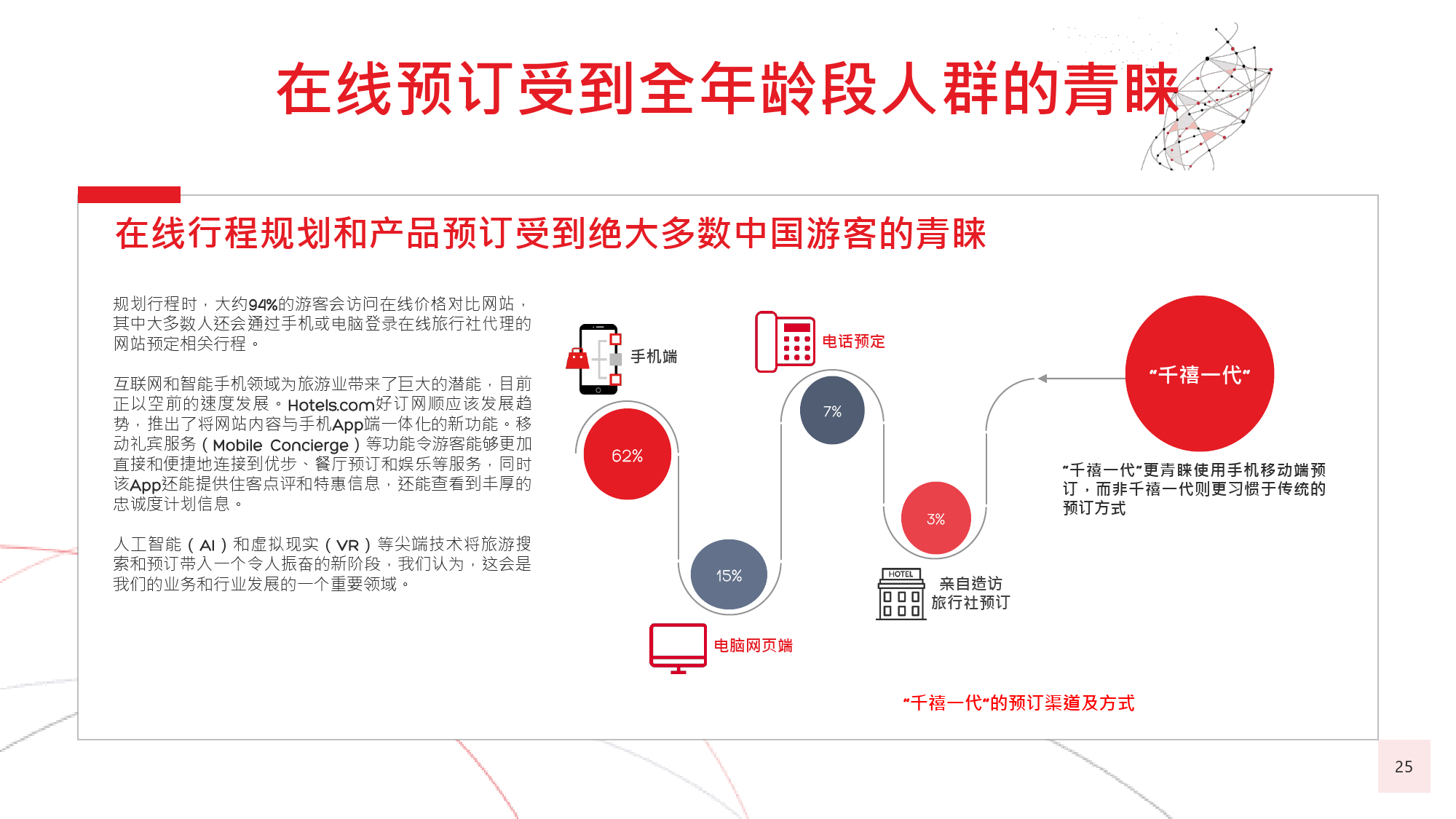 在今年的调查中,我们有个新发现,那就是在旅游偏好和 选择方面,年长游客与年轻游客间会彼此影响,尤其当60后随千禧一代子女一同出游时,该情况尤为显著。千 禧一代中的 后,尤其是还没有收入的人群受到父母的 强烈影响,这不足为奇;而让人感到意外的是,由于子女 更具冒险精神且更精通技术,反而更对 后游客群体产生强烈影响,促使他们选择更独立的国际旅行方式。