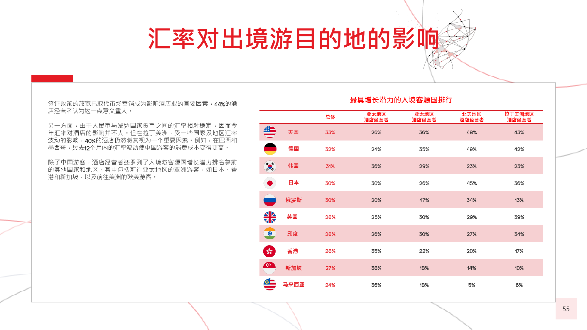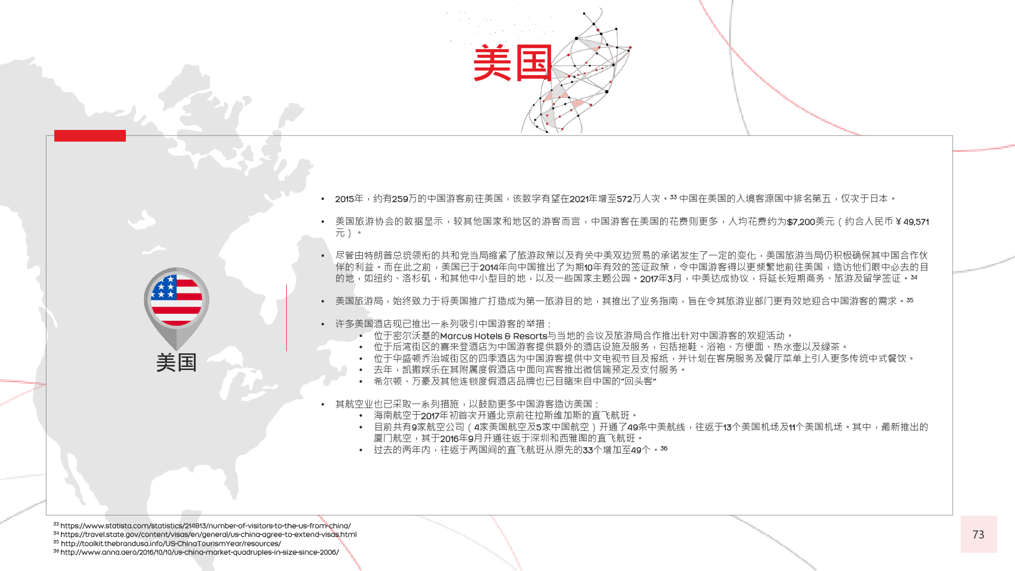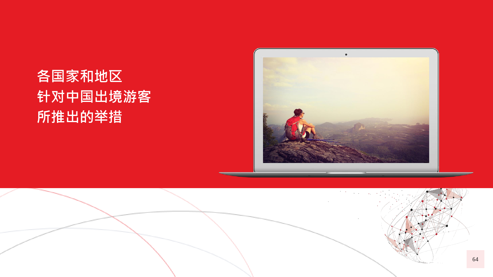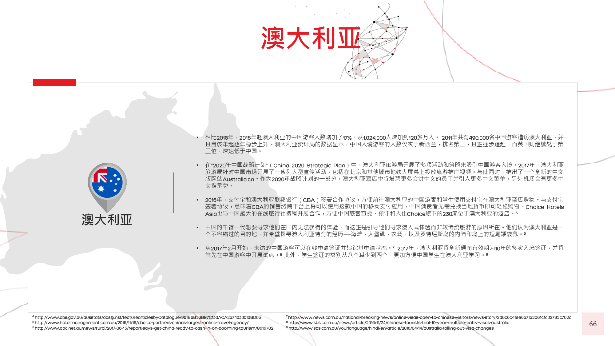 由于中国居民的消费水平日渐提高,全球很多国家放开 了对中国的签证政策,助推了中国出境游客人数的迅猛 增长。截至 年 月,与中国签署免签和落地签协议的 国家及地区已达 个,较上一年新增 个。包括美国、 加拿大、新加坡、韩国、日本、以色列和澳大利亚等在 内的国家及地区亦面向中国游客推出 年期多次入境签证。