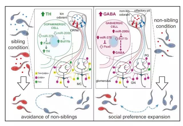 接下来,研究人员希望在基因层面上深入理解这种机制如何运作。通过测序,他们找出了两个关键的microRNA,microRNA是一类参与协调基因表达的分子。在筛选数百种可能性后,研究人员发现了microRNA-375和microRNA-200b,这是在吸引和厌恶情绪中控制神经递质转换的关键调节因子,它们影响两种基因——Pax6和Bcl11b的表达,最终控制了蝌蚪的游泳行为。