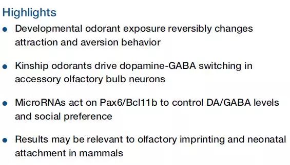 研究人员发现,这种现象基于一种名为“神经递质转换”的过程, 该研究的资深作者,加州大学圣地亚哥分校的生物学系教授Spitzer首创了这一大脑研究领域,第一作者Dulcis在精神兴奋剂和疾病大脑的背景下又进行了进一步研究。他们发现,多巴胺神经递质在正常家庭亲缘关系中处于较高水平,但在人造气味亲缘或“非亲缘”吸引的情况下切换到了GABA神经递质。