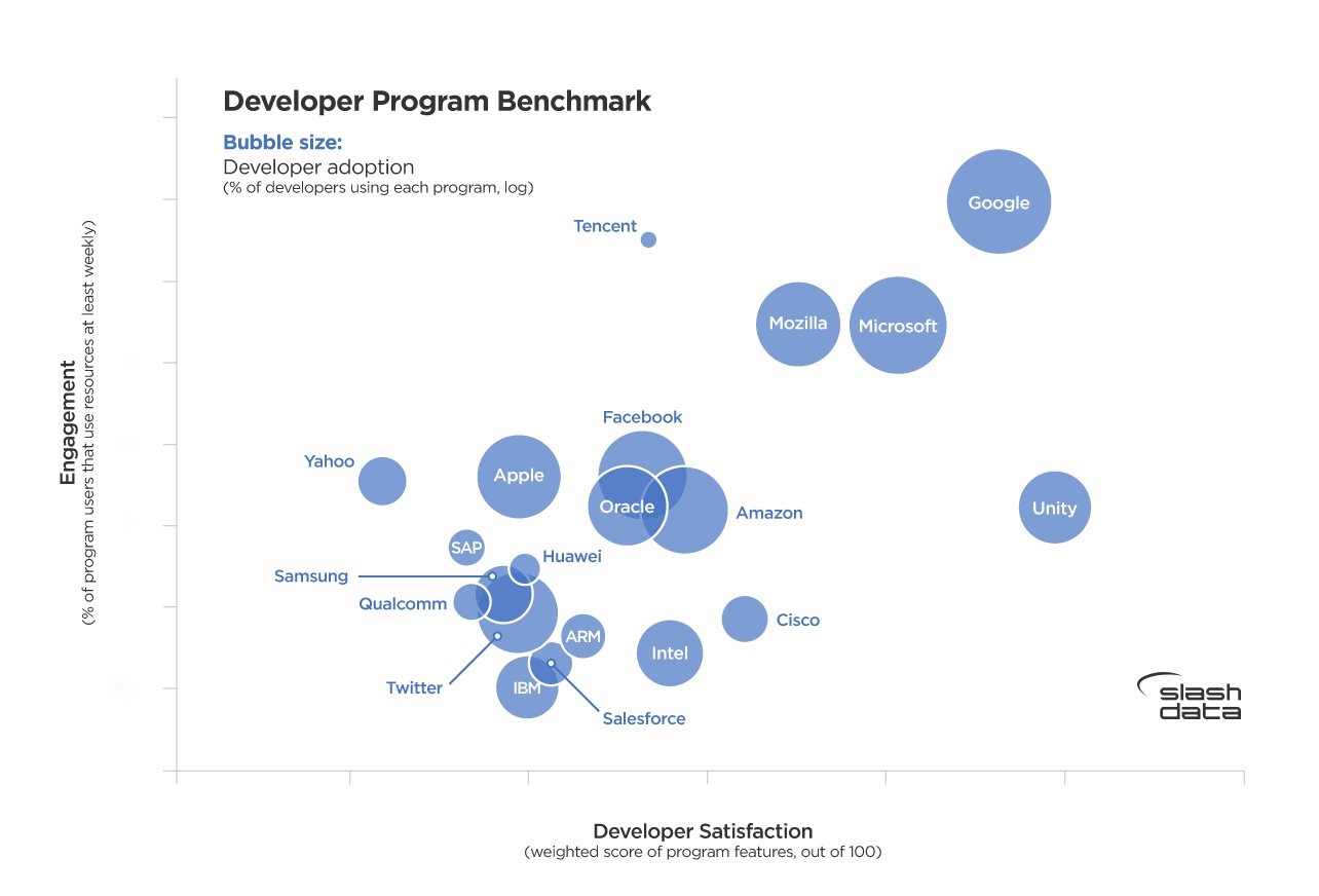 Google、Microsoft和Mozilla不仅是拥有庞大的开发者项目,开发人员的满意度和参与度方面也处于领先地位。亚马逊、Facebook、甲骨文和苹果等开发商紧随其后。