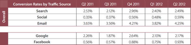 Monetate的报告还对比了不同流量来源的AOV和转化率,其中电子邮件的转化率最高,达到了4.25%,其后是搜索引擎(2.49%)和社交媒体(0.59%)。