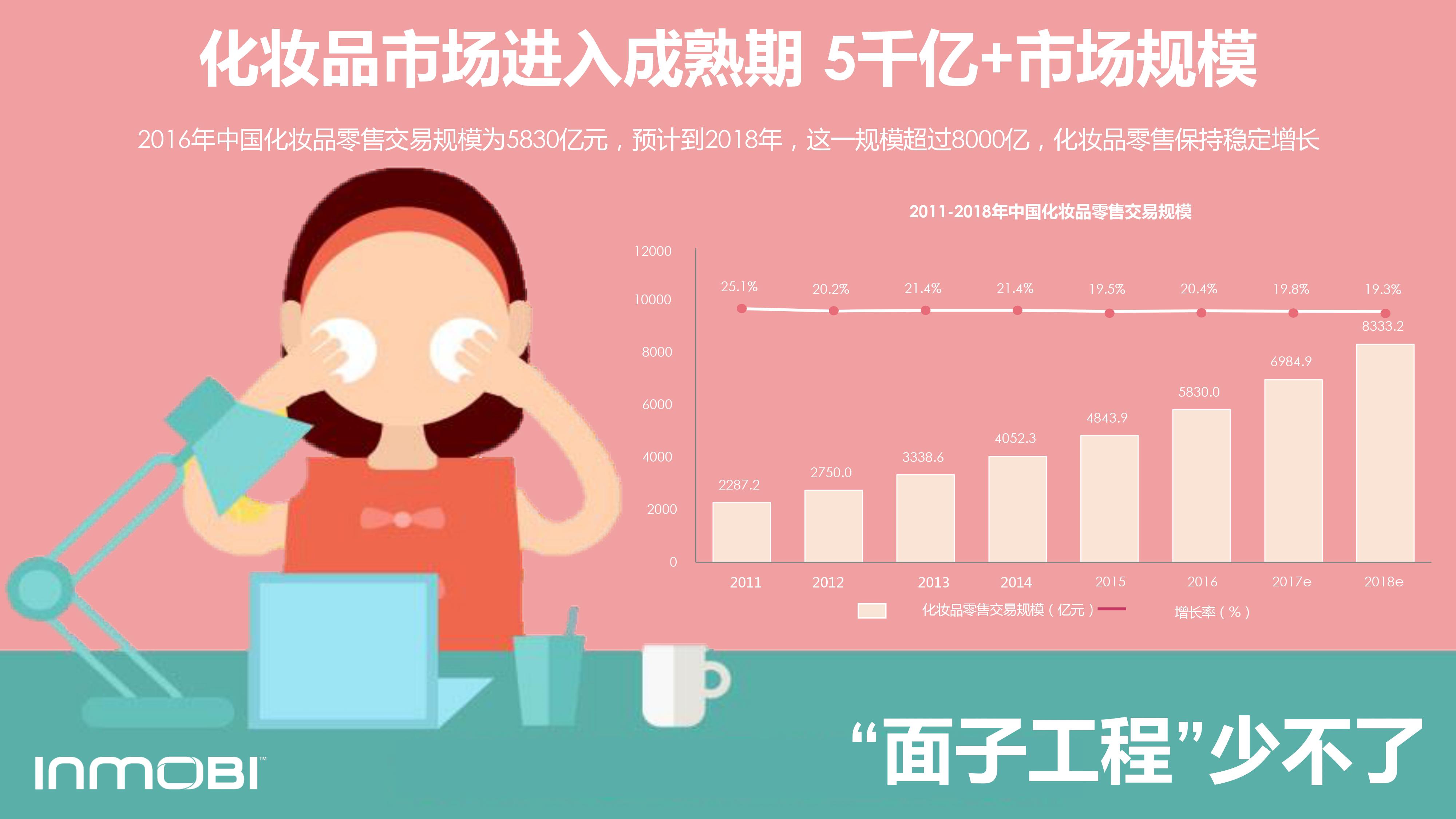 该报告显示,2016年中国化妆品零售交易规模达到了5830亿元,增长率达到了20.4%,而预计到2018年,这一规模将超过8000亿元,我国的化妆品市场已稳步进入成熟期。