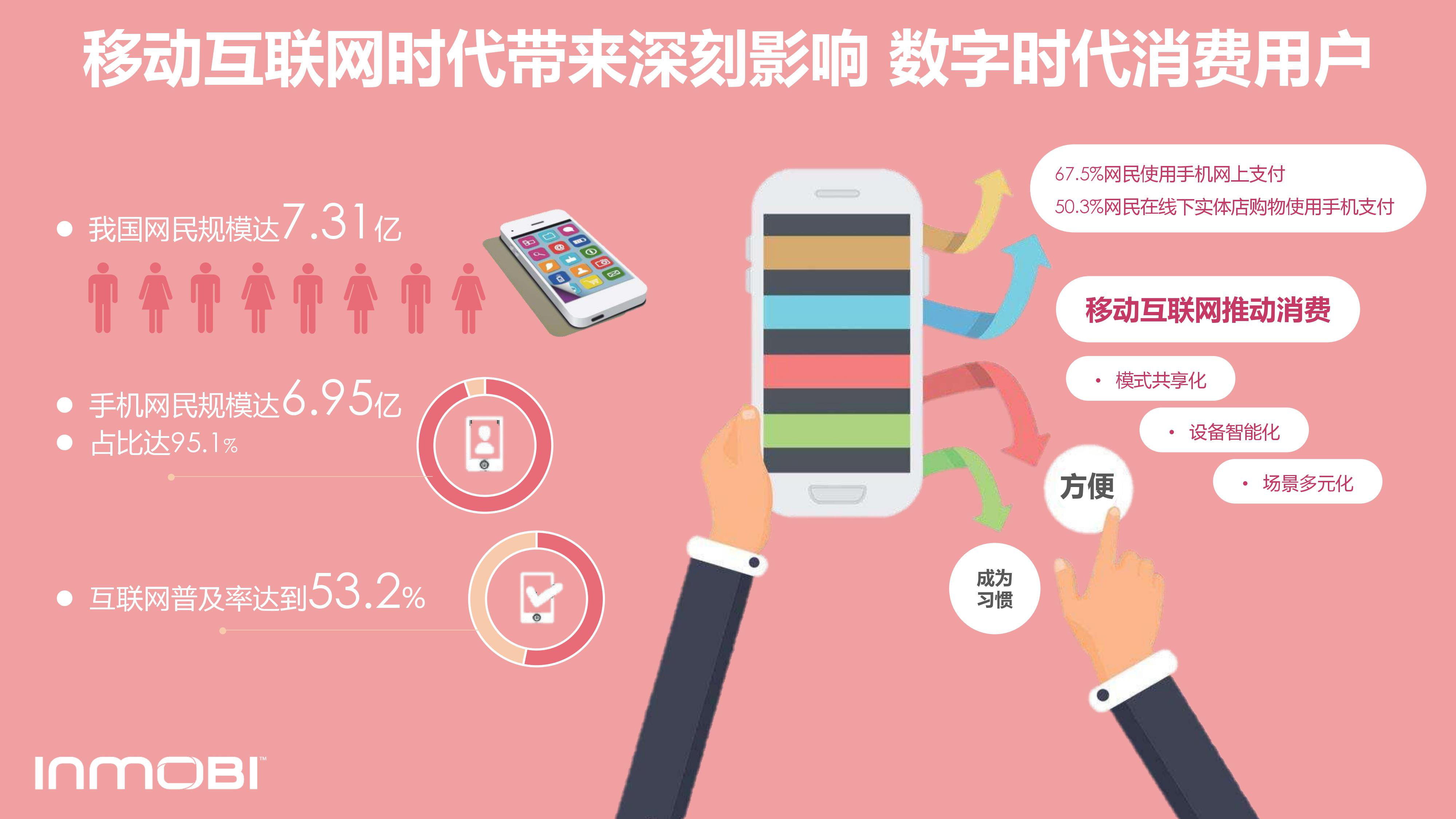 同时,在移动互联网的助推下,用户的消费方式也发生了重大的变革。在目前我国7.31亿网民中,手机网民占比达到了95.1%,为6.95亿。随着移动支付技术的成熟,手机逐渐成为人们最重要的支付工具之一,这个庞大的用户群体的巨大消费需求也因此得到了释放。InMobi该报告显示,手机网民中有67.5%使用手机网上支付,50.3%在线下实体店购物使用手机支付,手机支付已成为习惯。