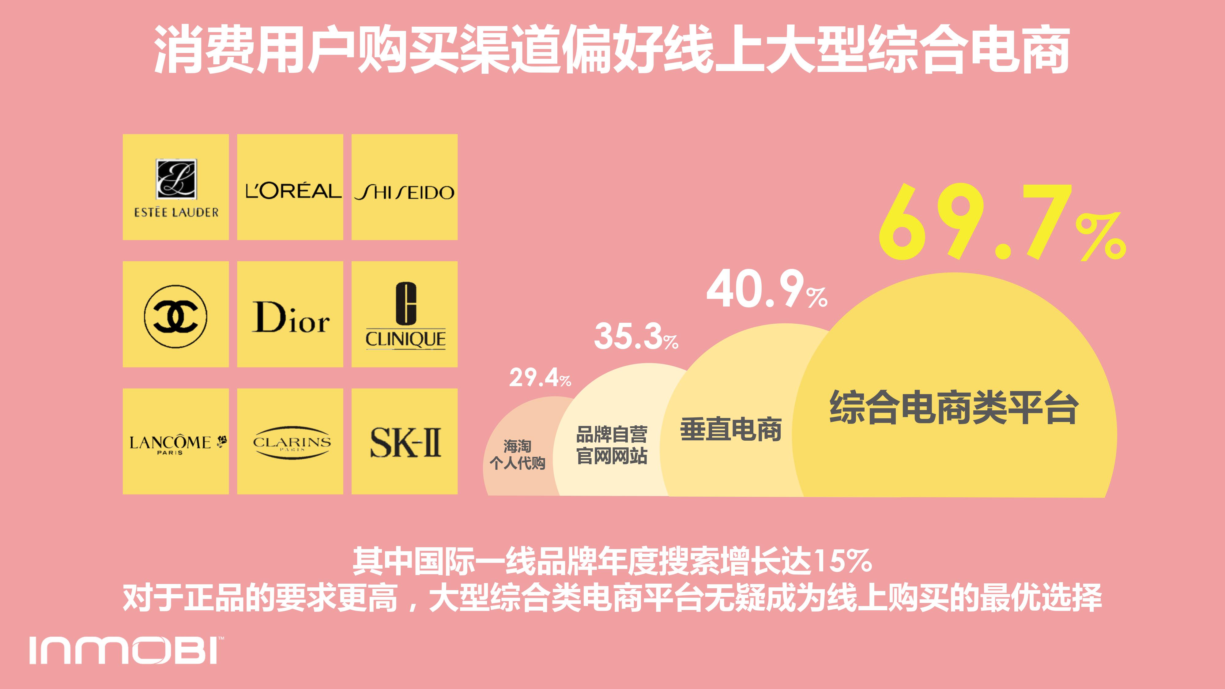 在线上购买渠道的选择上,69.7%的用户偏好大型综合电商,其次是垂直电商,占到了40.9%,品牌自营官方网站和海淘个人代购分别占到了35.5%和29.4%。
