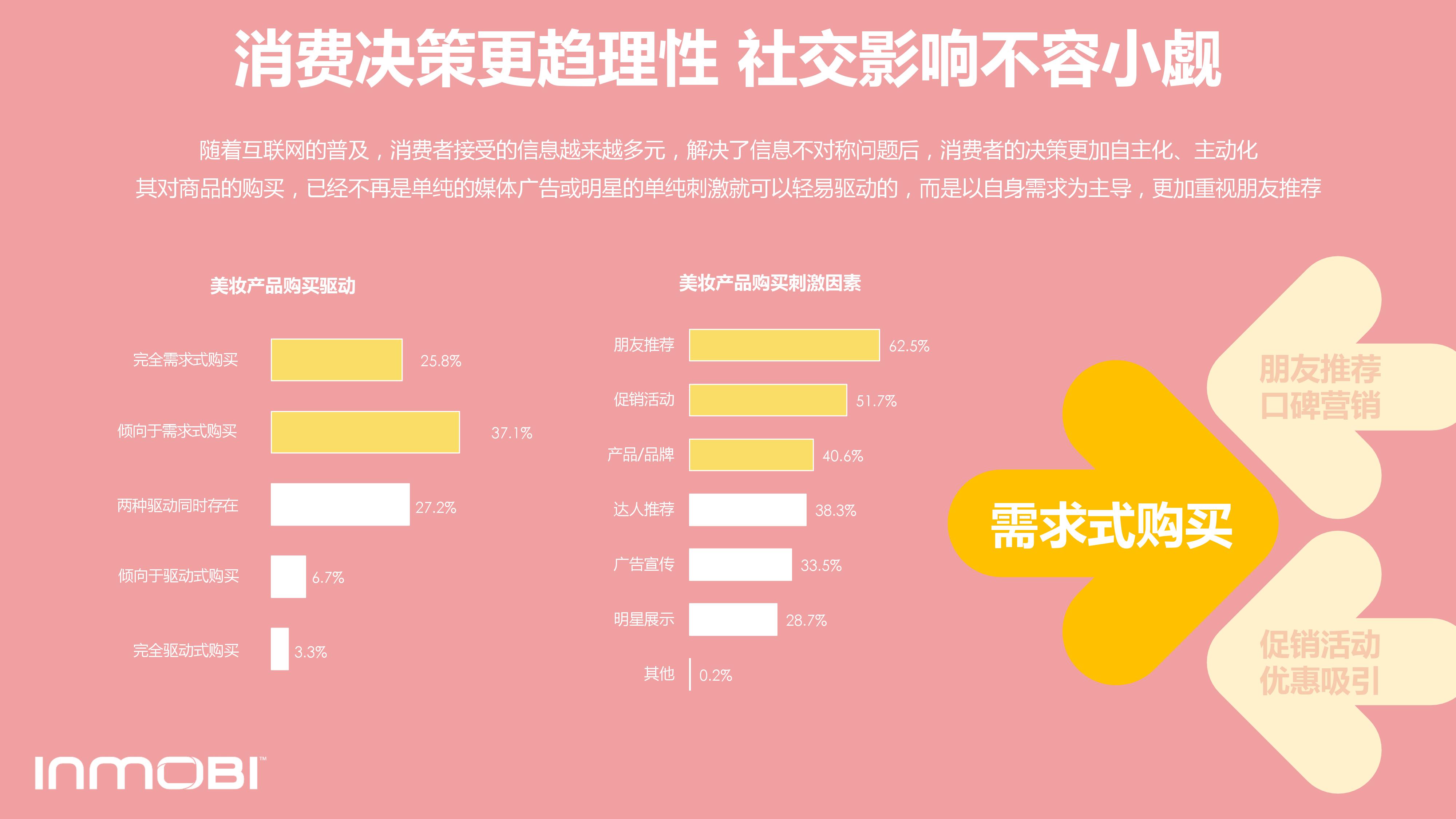 除此之外,用户线上消费倾向也十分明显,他们特别关注化妆品品牌以及产品本身的质量、功效,同时口碑的影响也在逐渐提升。而他们在做决策时,则主要以自身需求为主导,更加重视朋友推荐。