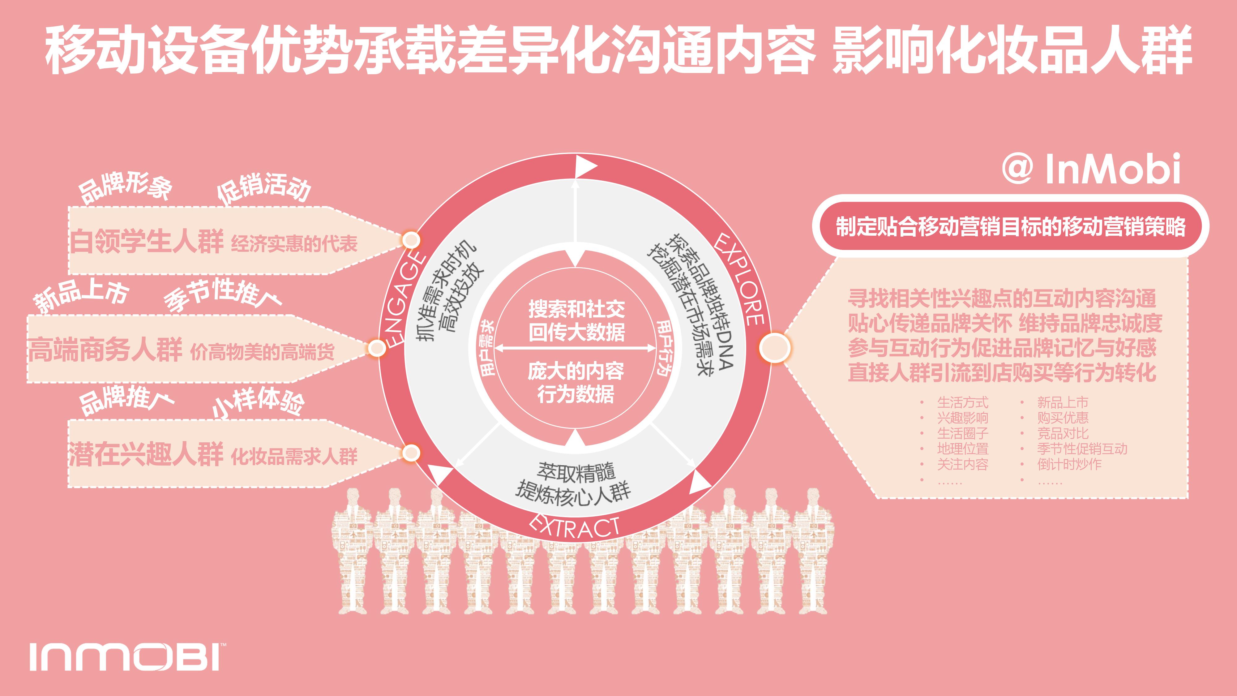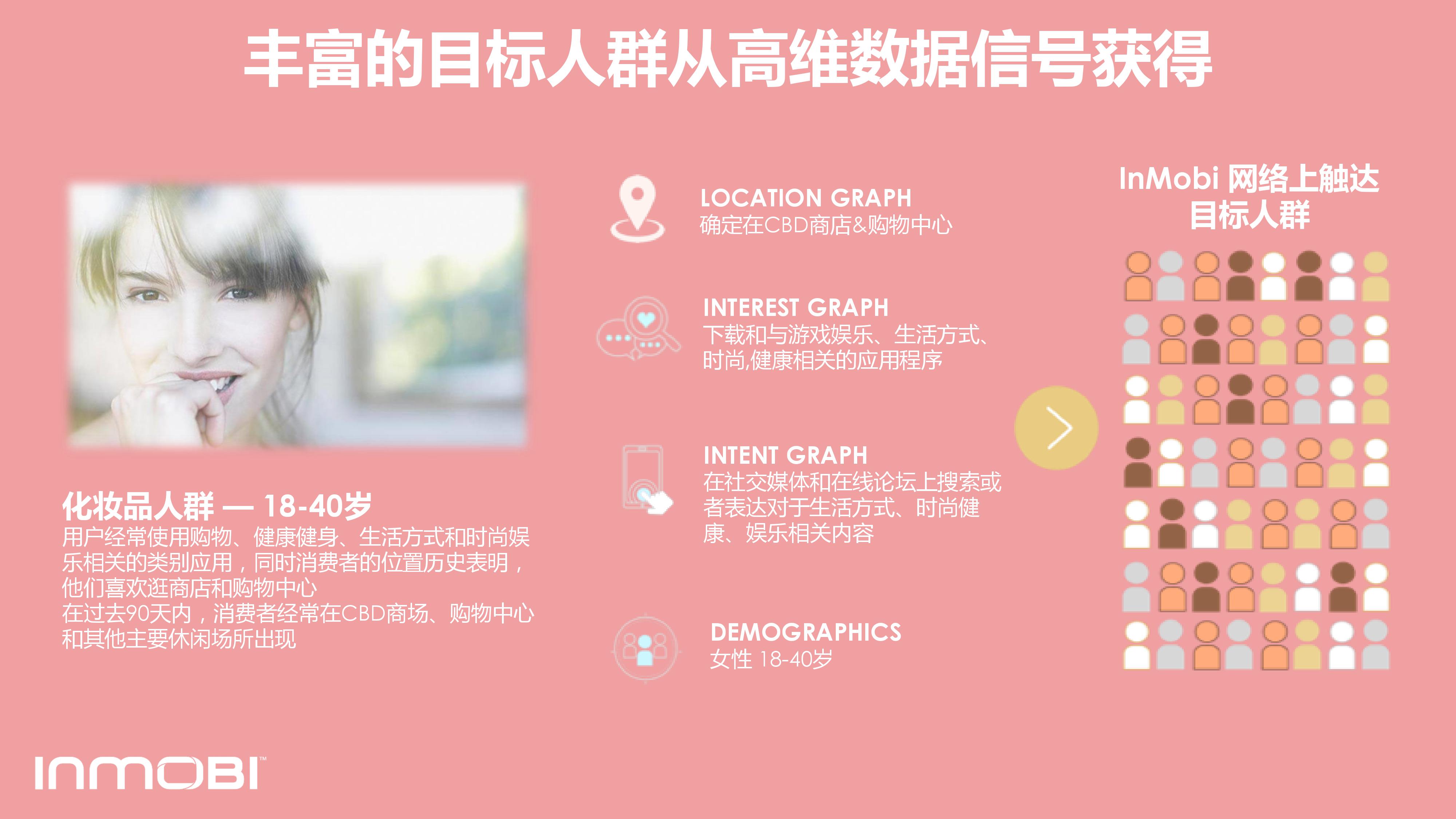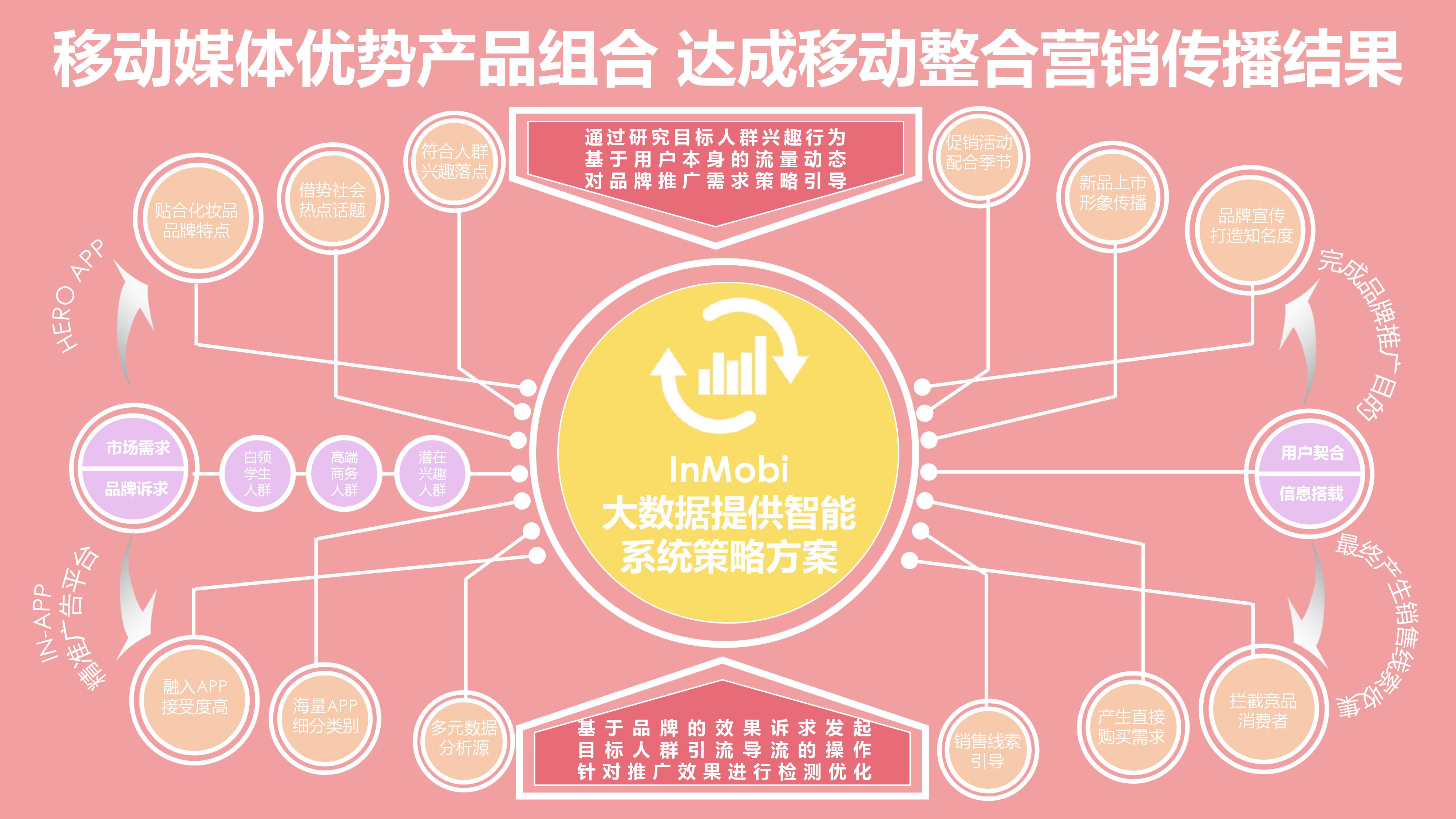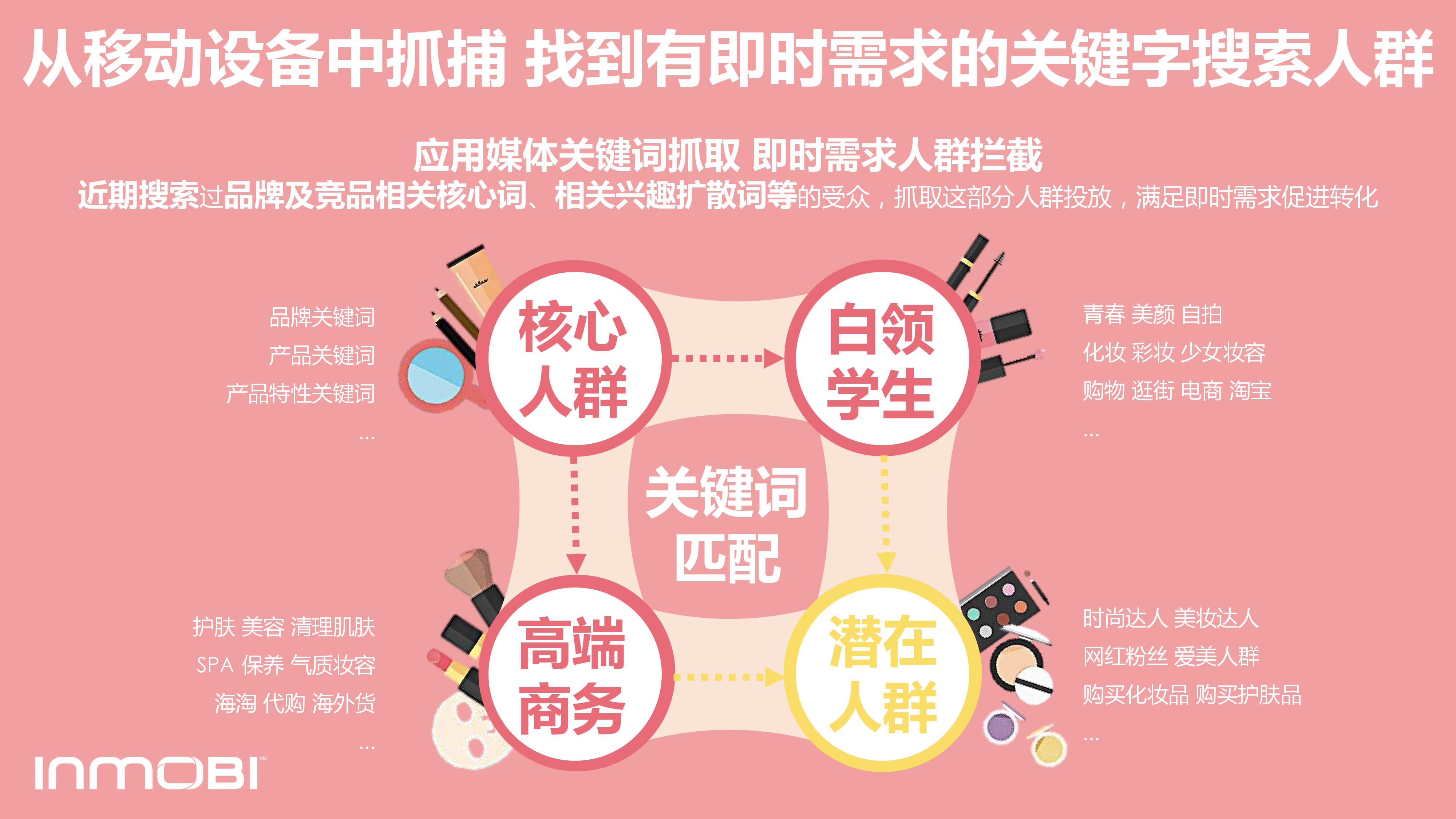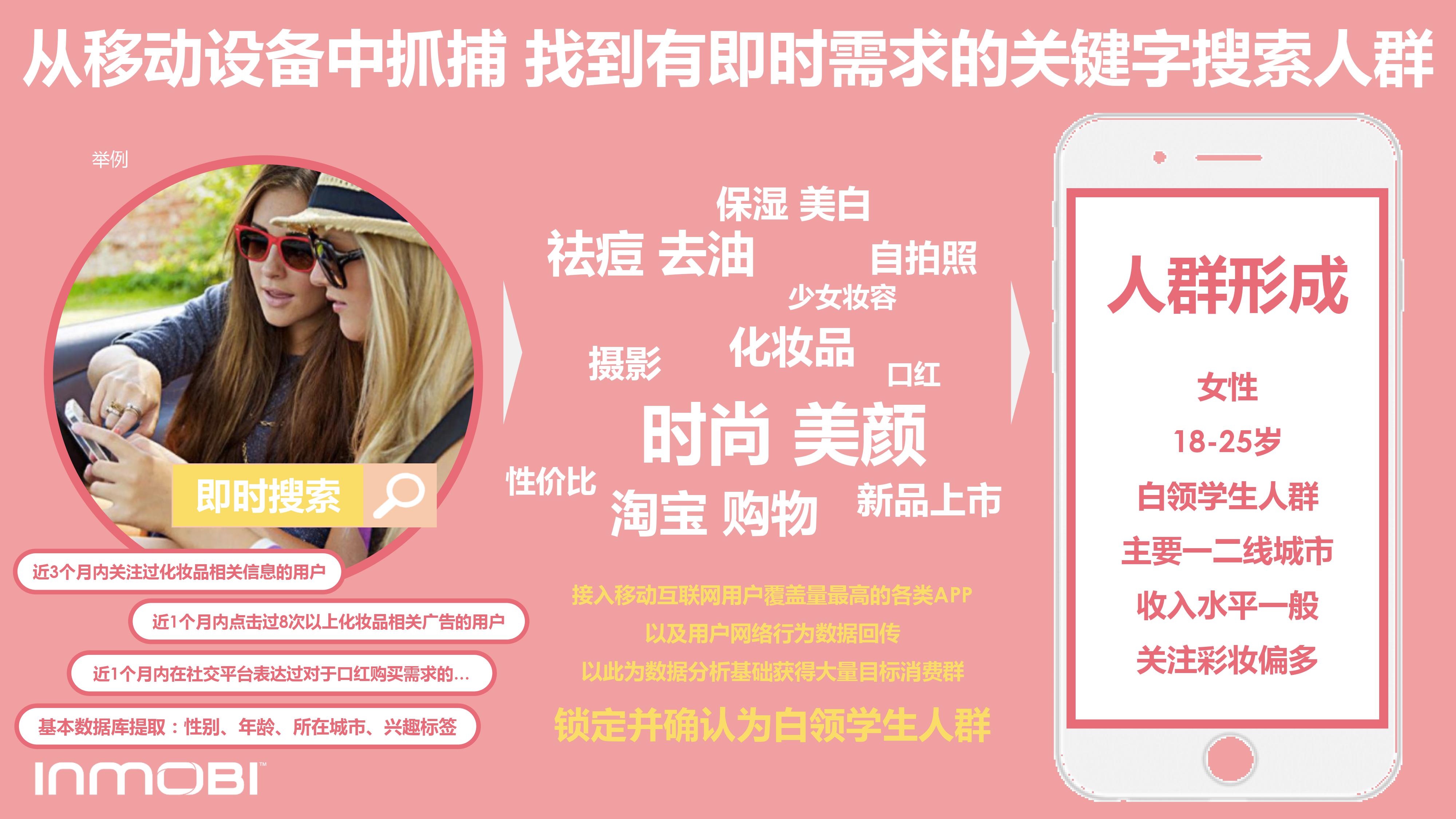 此外,InMobi还将利用庞大的媒体矩阵,进行移动媒体优势产品组合,为用户提供差异化、高度定制的沟通内容,从而更有效地影响化妆品用户,提升移动整合营销传播结果。同时,从移动设备中抓取有即时需求的关键字搜索人群进行投放,满足其即时需求,促进转化。