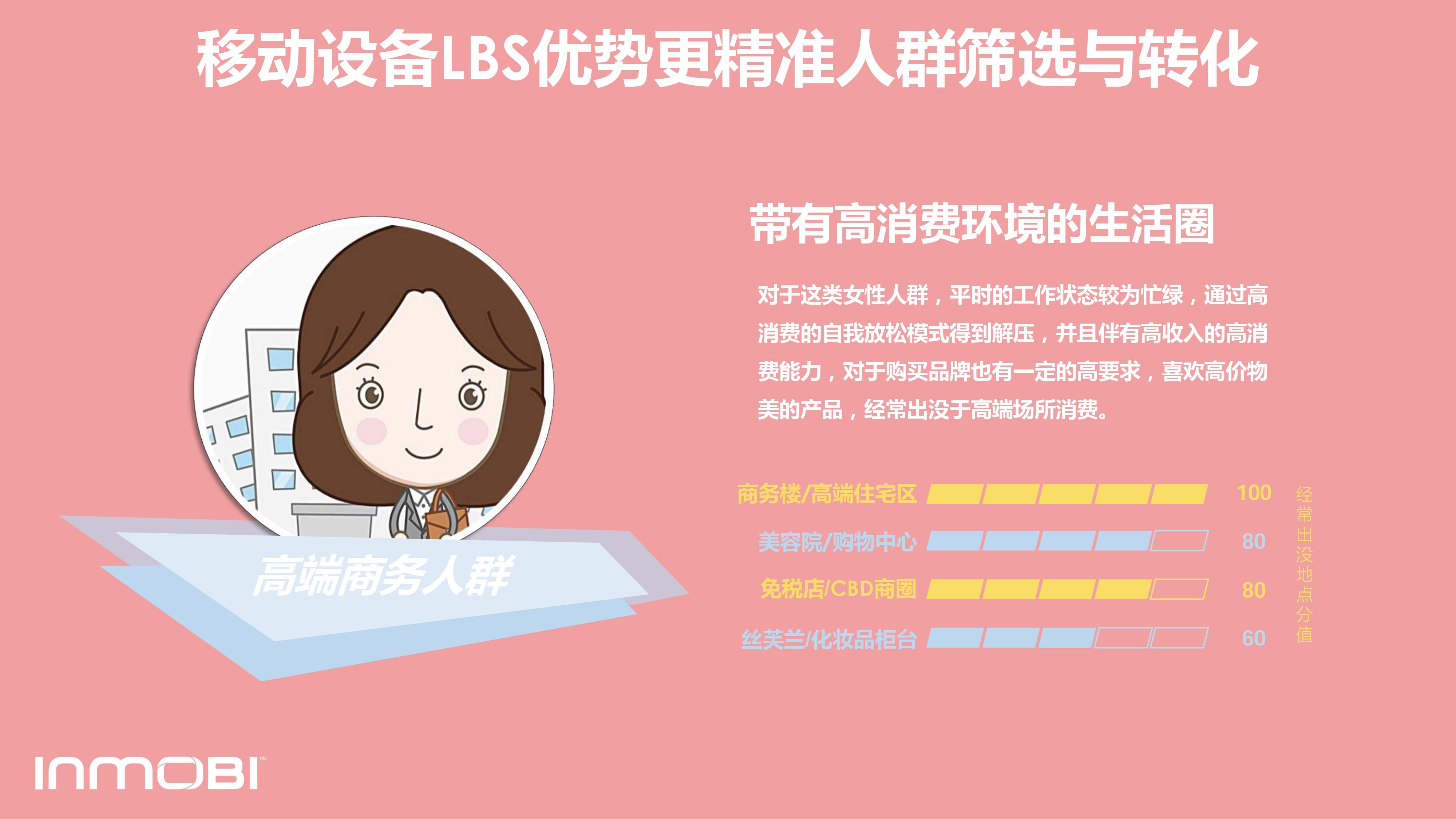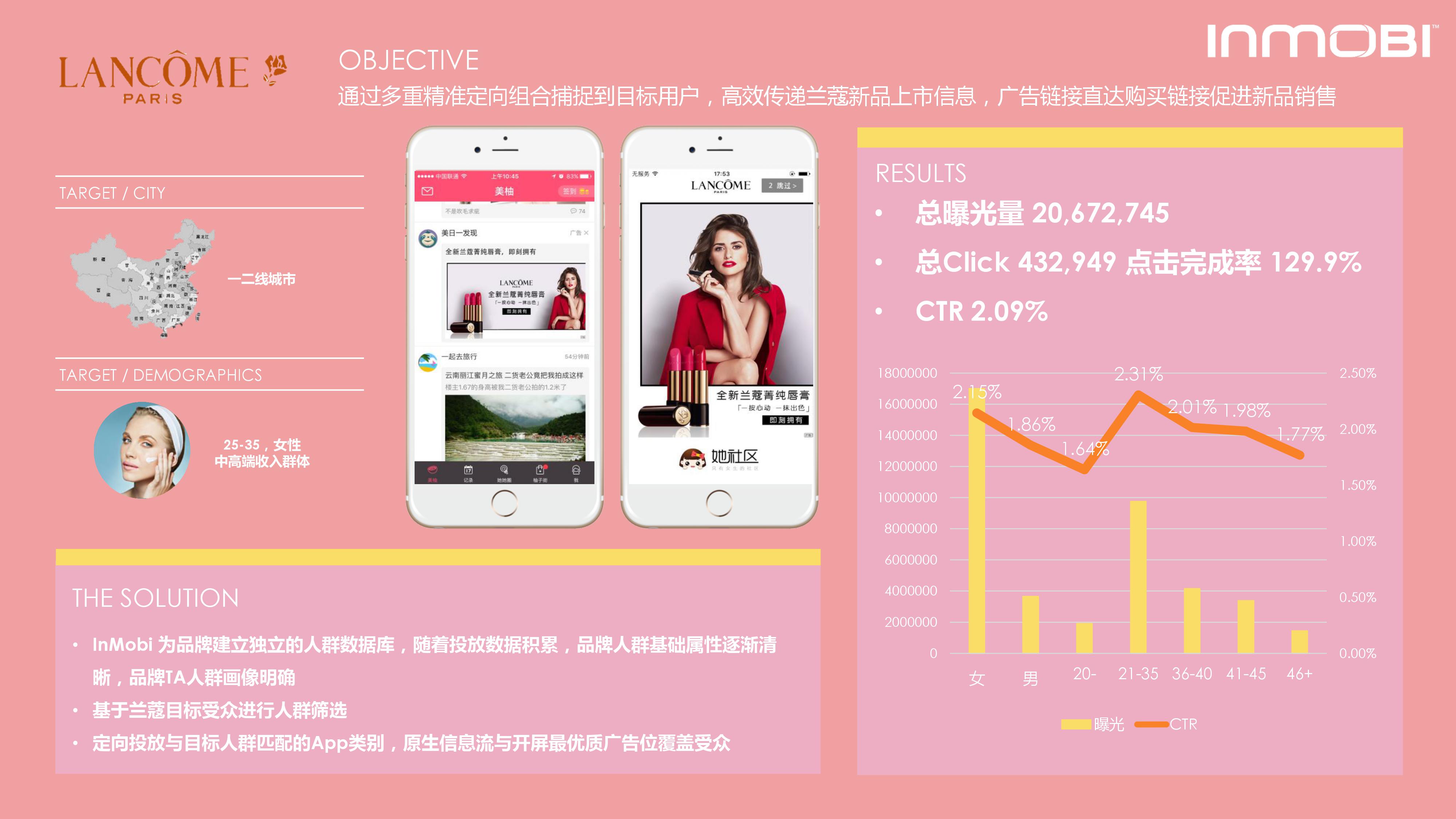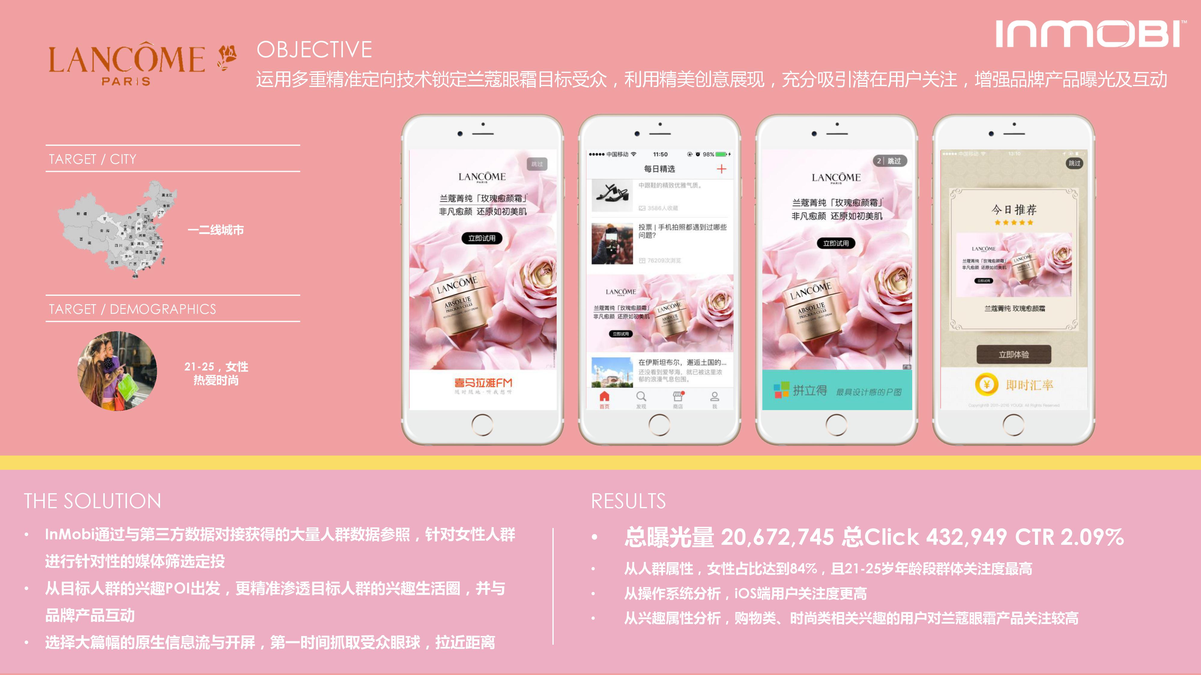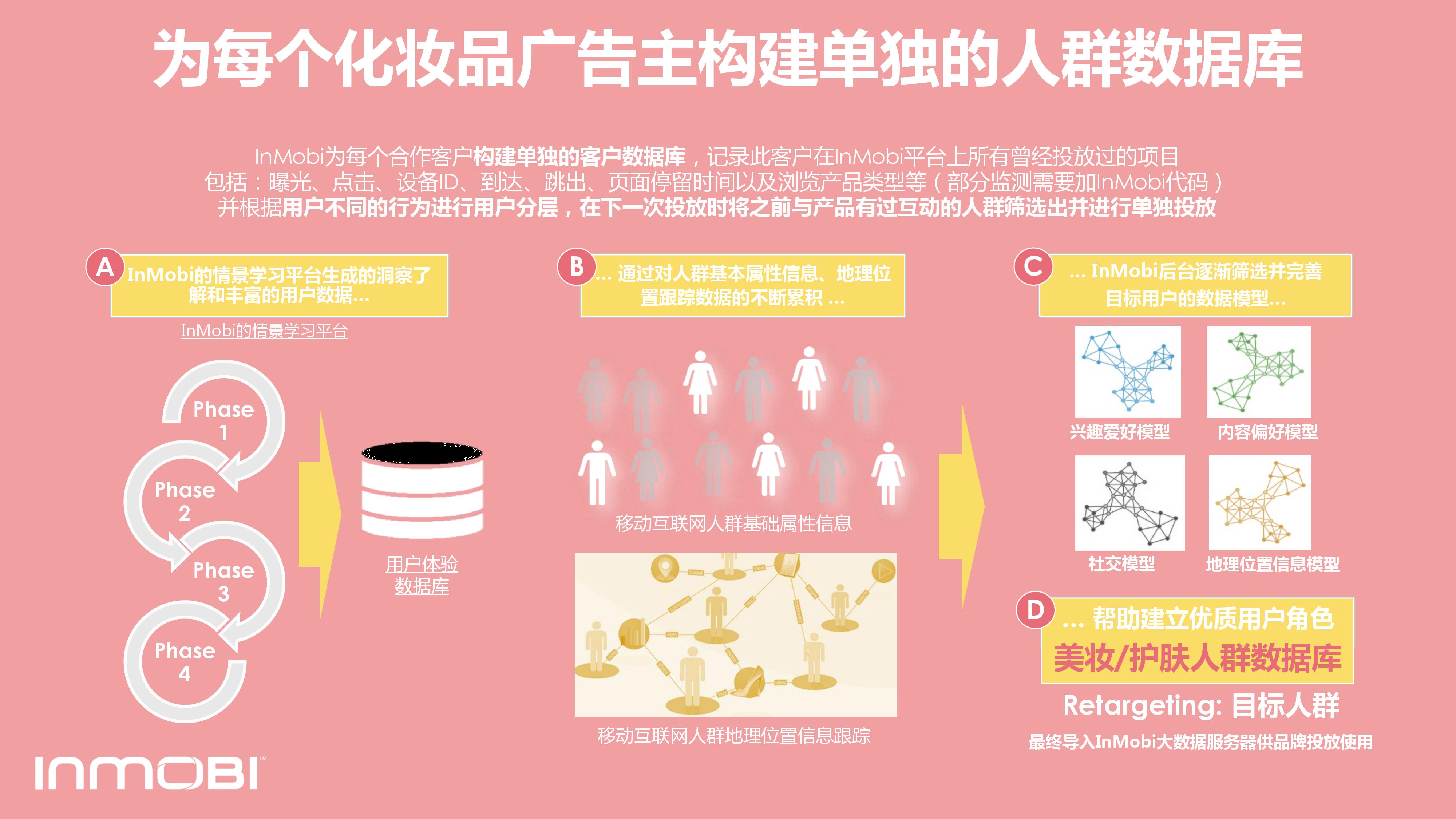 此外,InMobi还将利用庞大的媒体矩阵,进行移动媒体优势产品组合,为用户提供差异化、高度定制的沟通内容,从而更有效地影响化妆品用户,提升移动整合营销传播结果。同时,从移动设备中抓取有即时需求的关键字搜索人群进行投放,满足其即时需求,促进转化。