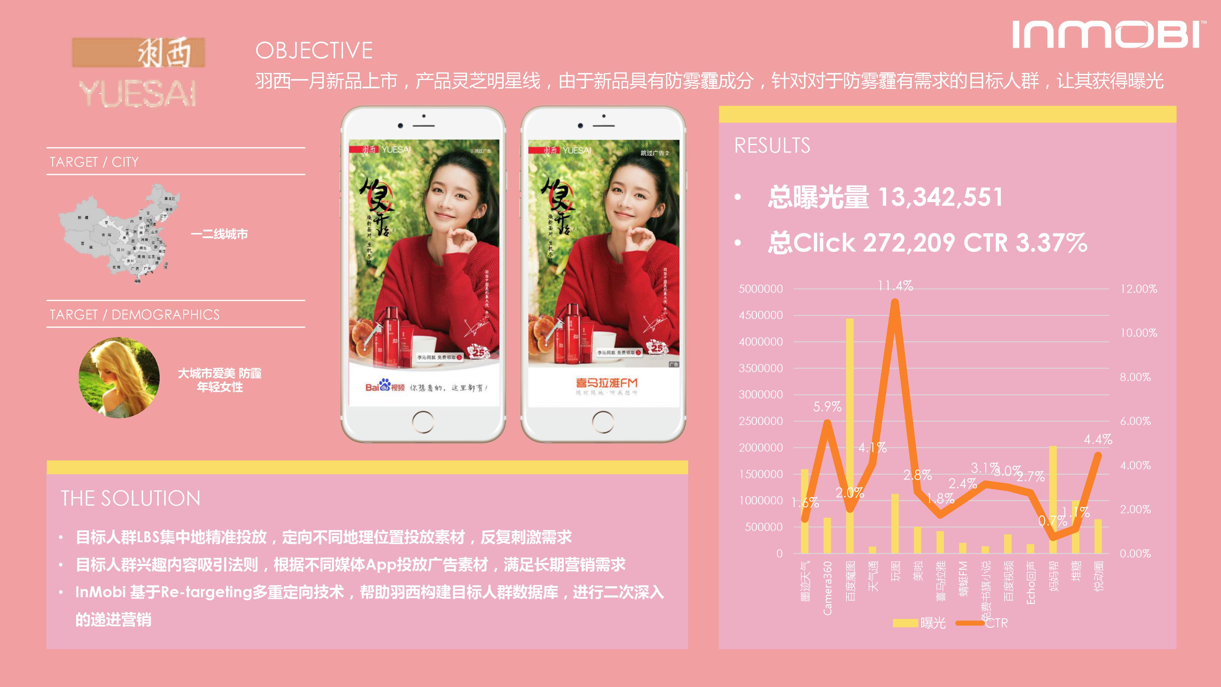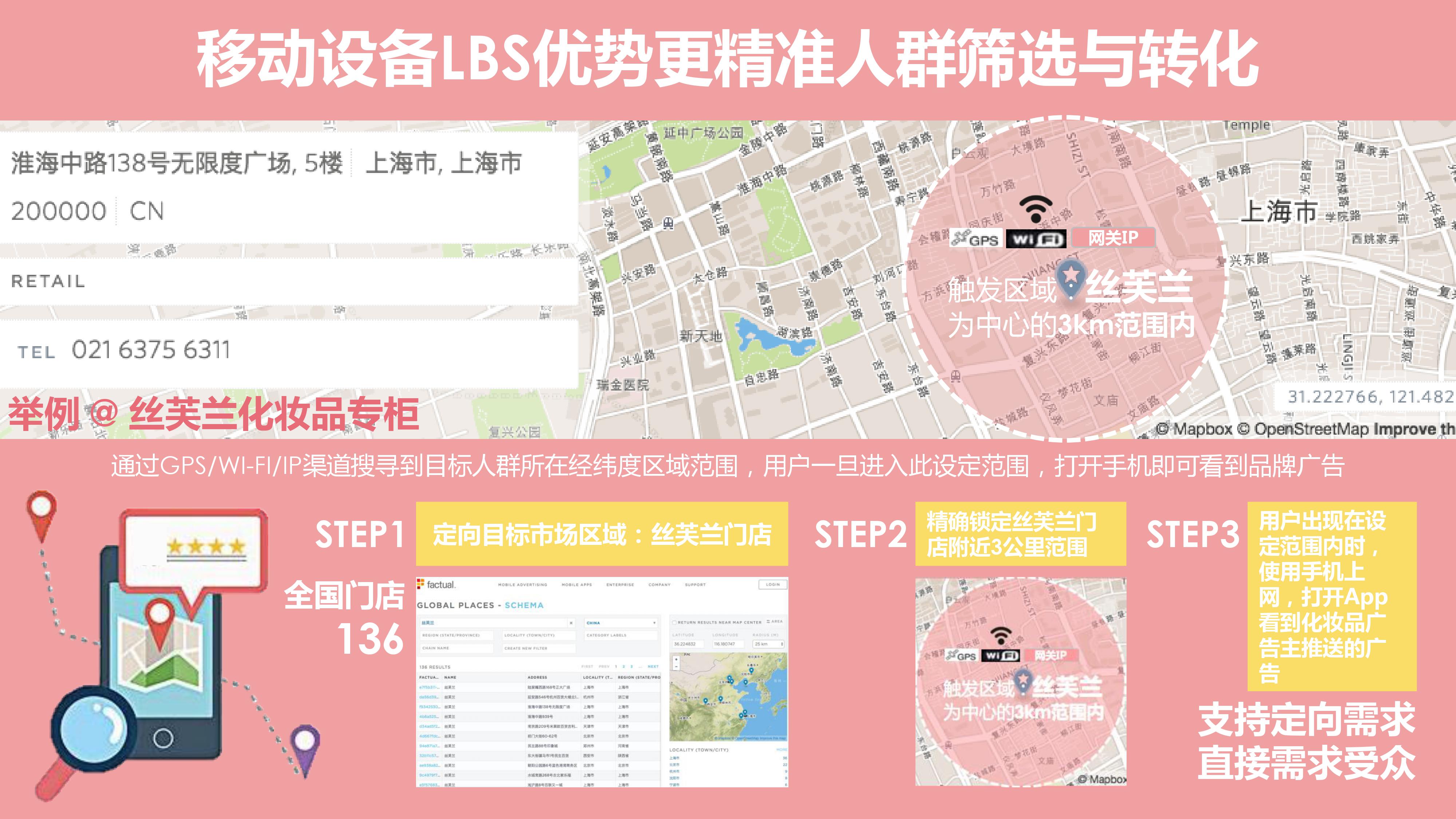 化妆品广告主还可以利用移动设备LBS优势,以用户手机GPS定位、Wi-Fi、IP为基础,对用户地理位置历史轨迹及周期频次进行分析,筛选目标消费群。基于这一技术,化妆品广告主便可以在指定地区周边范围进行定向投放,或者判断潜在受众地理位置,根据品牌推广需求进行引导。如羽西1月新品上市时,因该产品具有防霾成分,所以采用了目标人群LBS集中地精准投放,定位不同地理位置投放素材,反复刺激需求。这次投放最终收获了1300多万的曝光,总点击超过270万,点击率达到了3.37%。