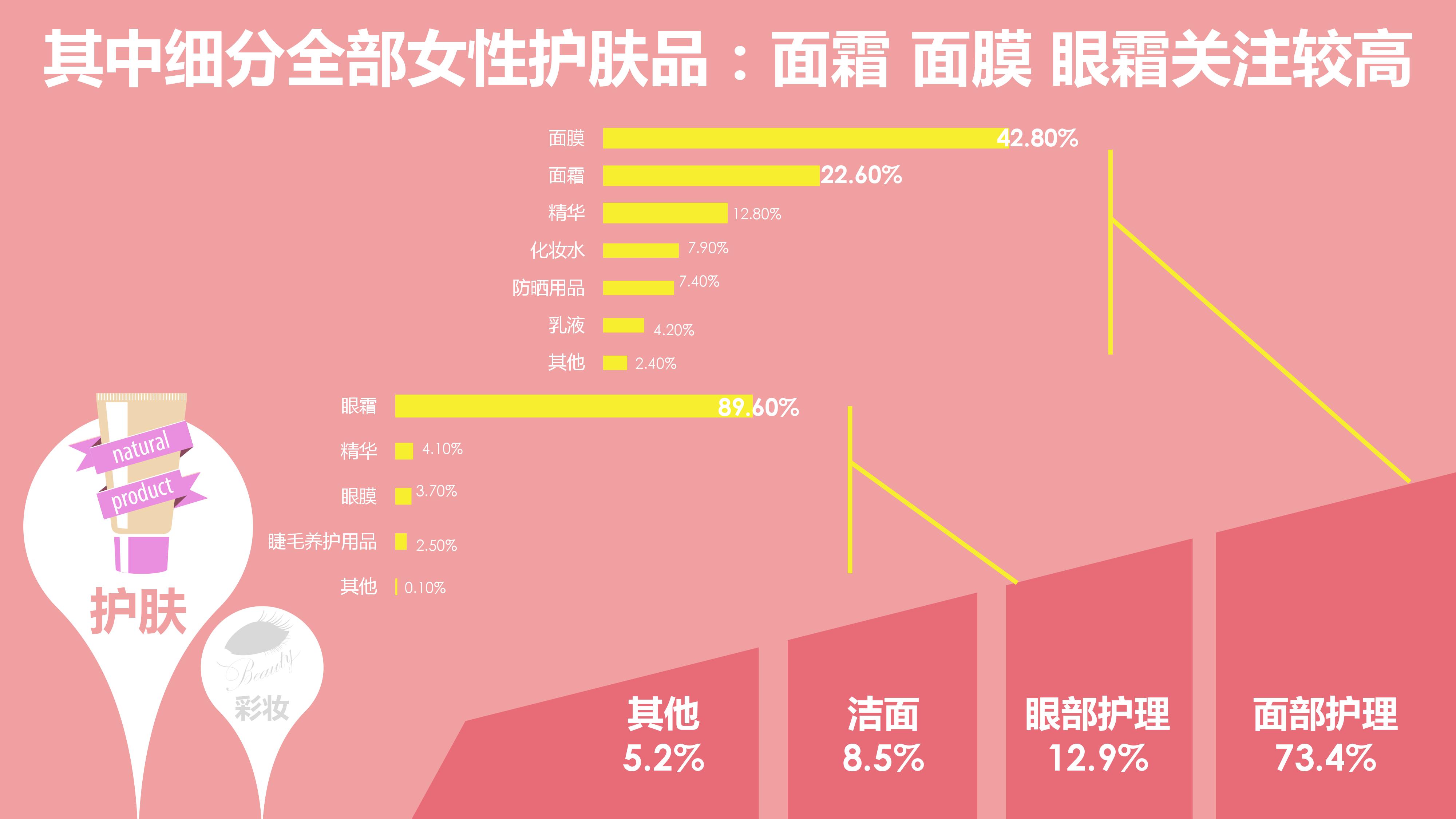 该报告也对化妆品用户的人群画像进行了描摹,这个群体以18-35岁的80、90后为主,占比达到88%,涵盖了拥有稳定收入、追求新鲜时尚、爱美的白领学生人群。不过,收入情况也直接影响着他们对于化妆品的投入以及选择。作为主体的白领学生人群,有近1/3的女性护肤品的年消费金额集中在1000-3000元,有35.2%彩妆年消费金额在1000元以内。而高阶人群则依靠高收入,消费也更高,同时也更注重品牌,在购买渠道和品牌产品国的选择上也更多元化。从护肤品来看,50%的高阶女性年消费金额在10000万以上,以国产和欧美品牌为主,其中面膜、面霜、眼霜的关注较高,祛斑、保湿、抗衰老和防晒的关注度明显提升。从彩妆来看,31.5%的高阶女性年消费金额在10000元以上,超过九成使用欧美品牌,主要关注面部、唇部和眼部彩妆,这三个品牌的搜索量占比之和接近90%。