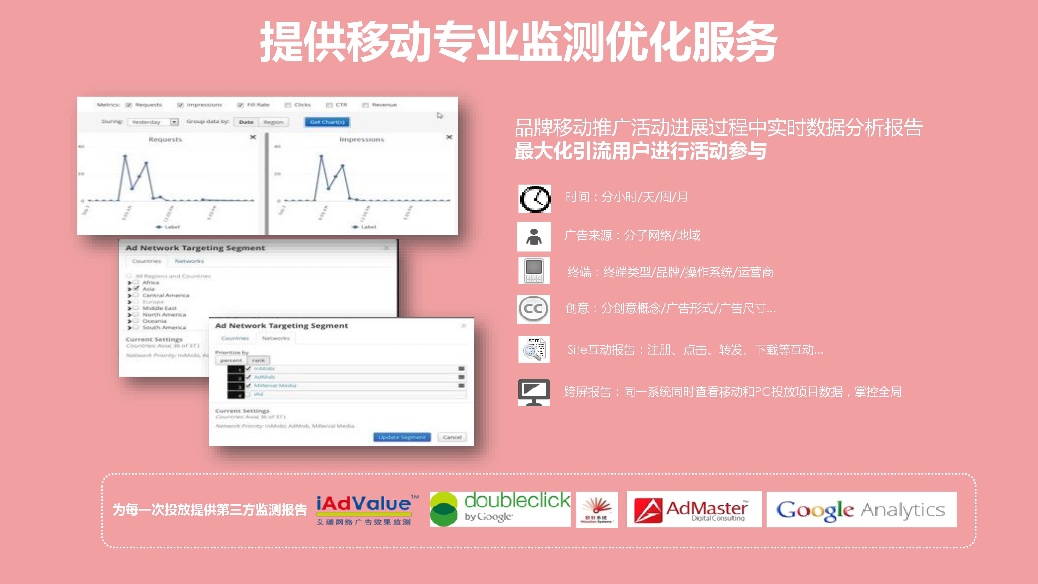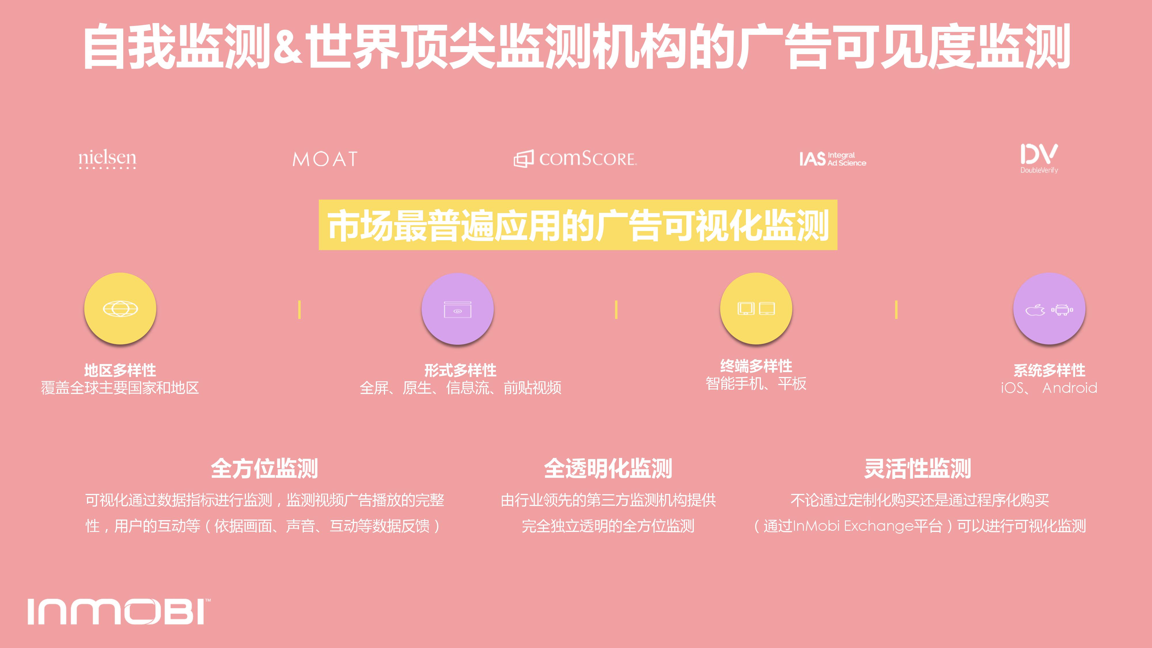 作为行业内可视化的先锋,InMobi也提供了最完整的数据监测,确保效果一览无遗。除了自我监测之外,他们也与MOAT、IAS等世界顶尖的监测机构合作进行广告可见度的监测,而这些所有监测都只需要集成一个SDK便可以实现。