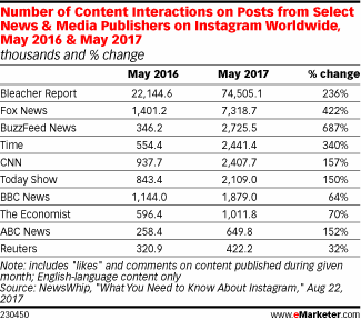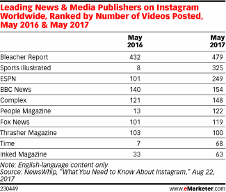 2017年5月,以体育为重点的网站Bleacher Report在Instagram上发布了479个视频内容,超过了其他发布商。