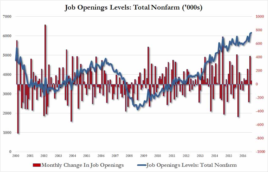 7月的工作开放率,即开放工作数量占就业人数和开放工作数量总和的百分比,保持在历史新高的4%。
