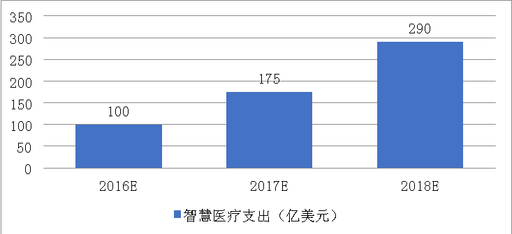 TrendForce旗下拓墣产业研究所测算2016-2018年全球智慧医疗服务支出年复合增长率约60%,至2018年全球智慧医疗服务支出,如远端监测、诊断设备、生活辅助、生理数据监测等,有望达290亿美元(见图表4-14)。