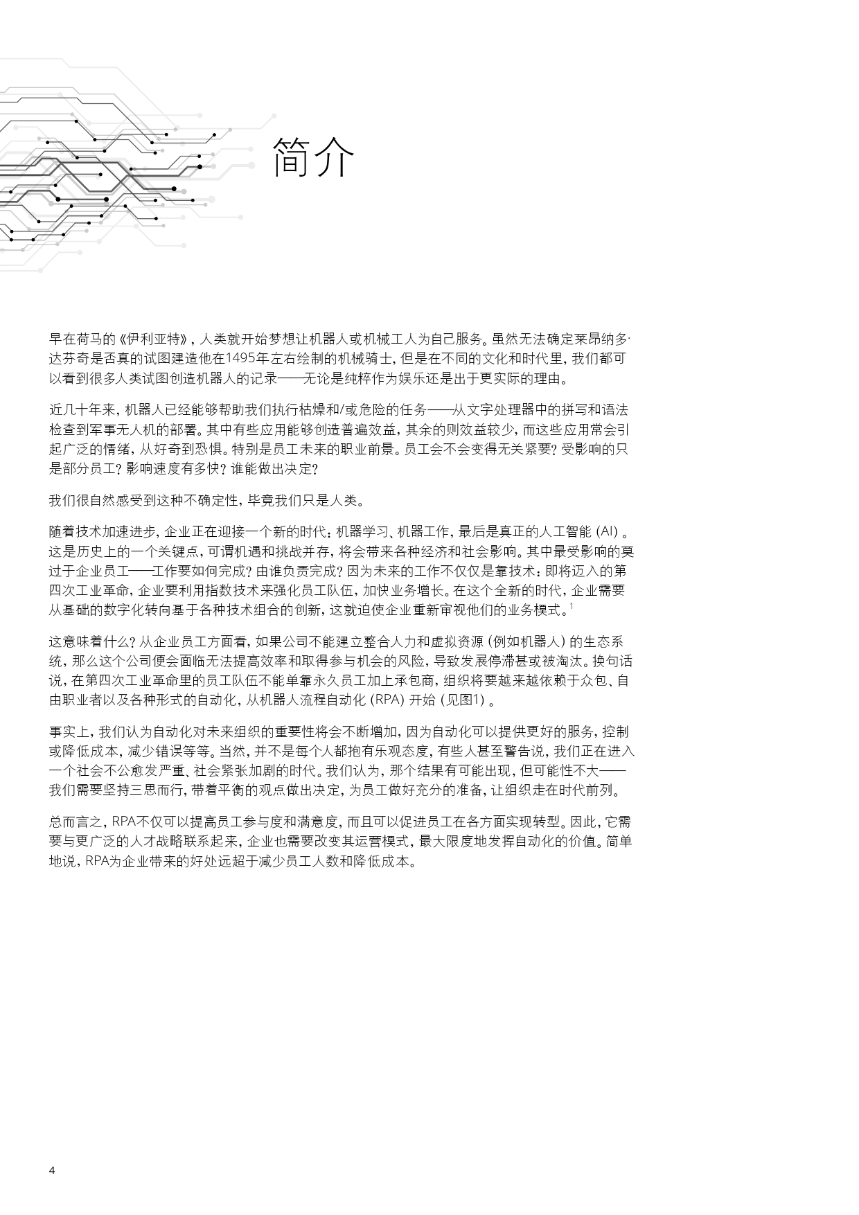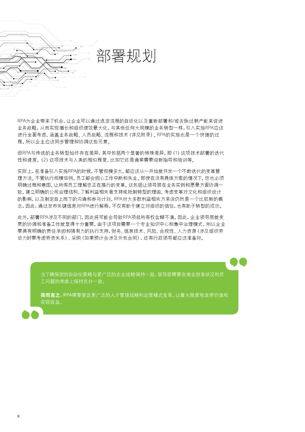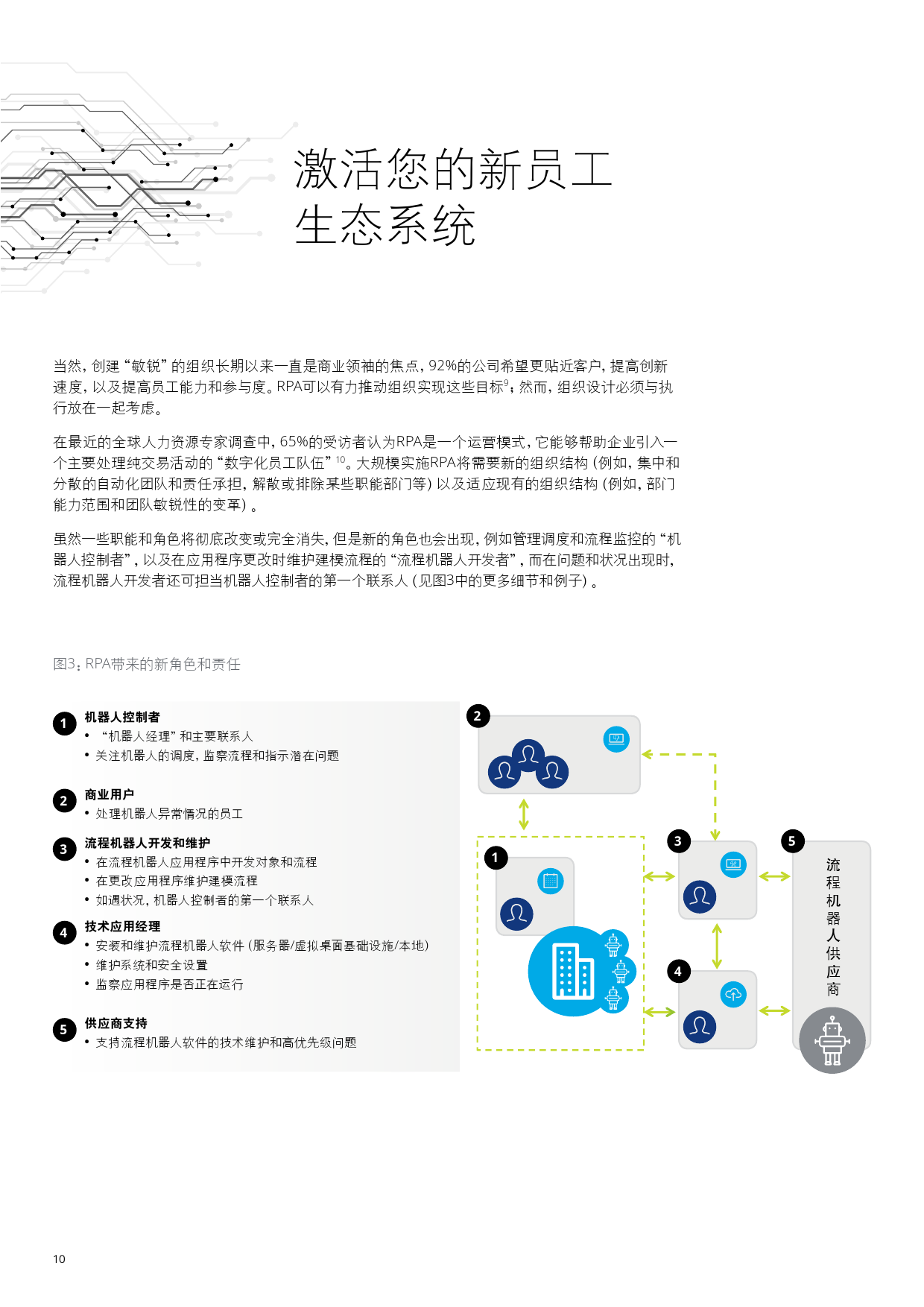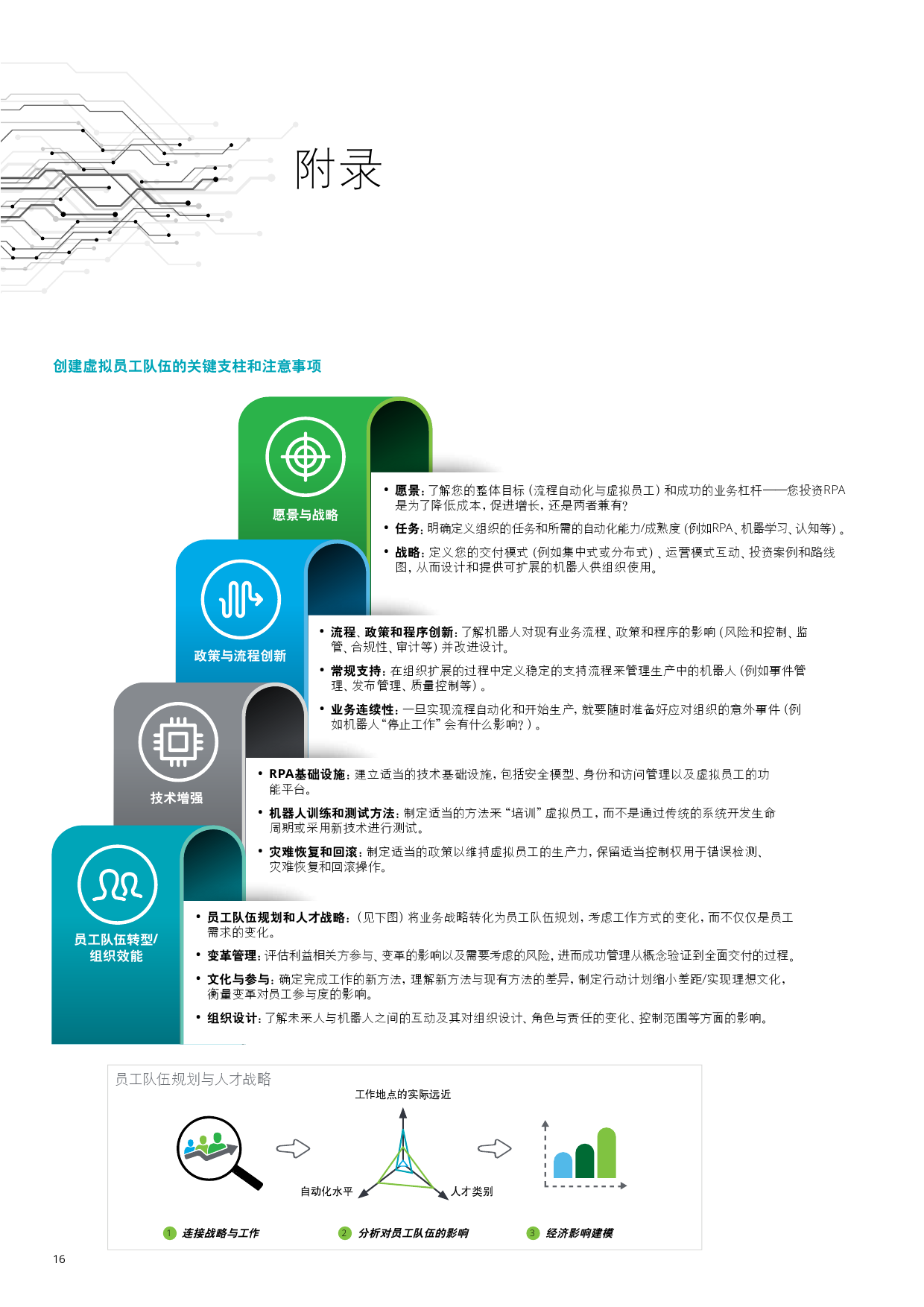 本报告勾划了在机构部署RPA的路线图,报告又指出未有把自动化纳入人力资源全局考虑的企业将会面临错失提升效率和质量,减轻风险和推动创新和增长的机遇。