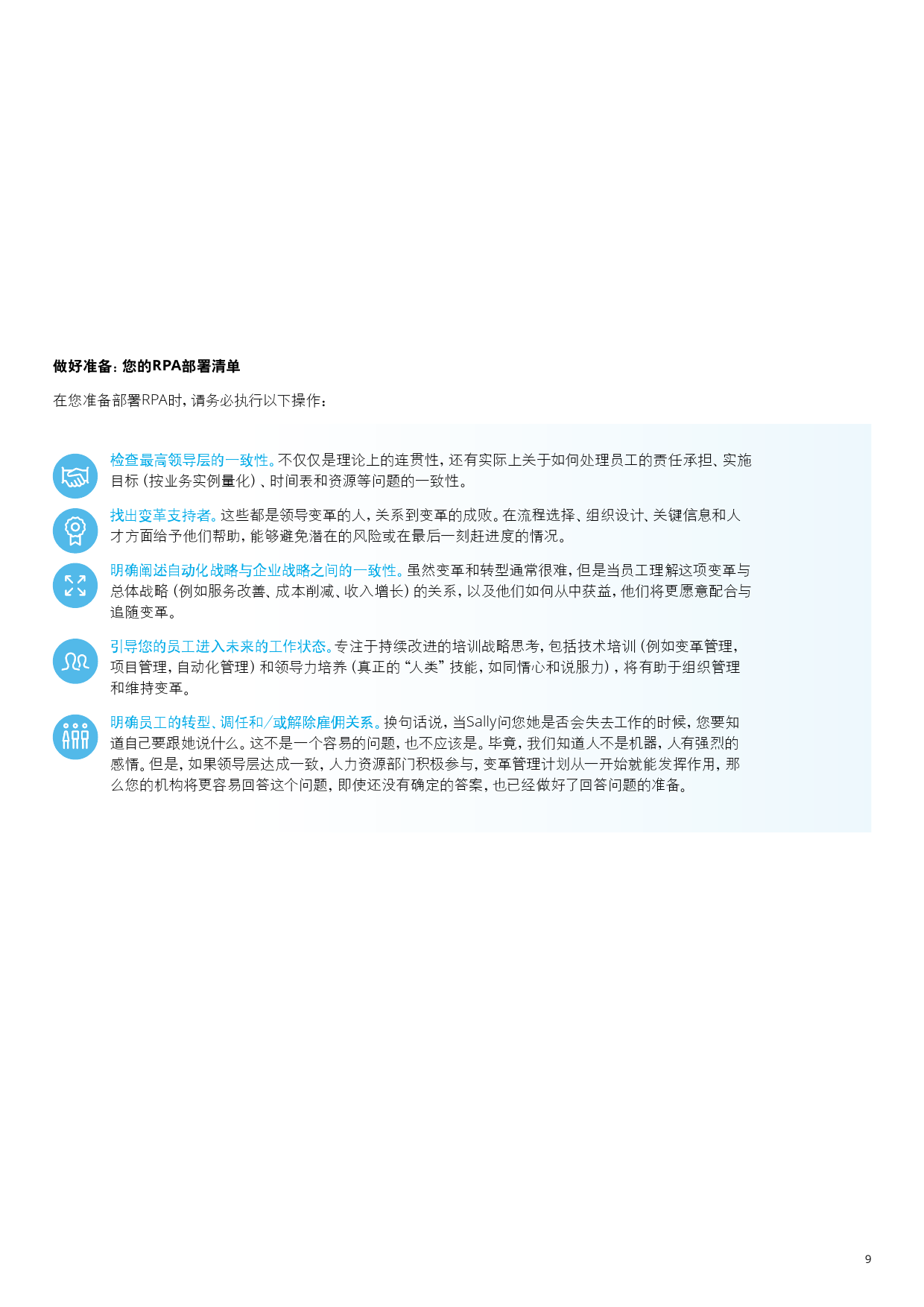 - 决定那些工作流程适合被自动化,同时理解RPA 对员工的影响。