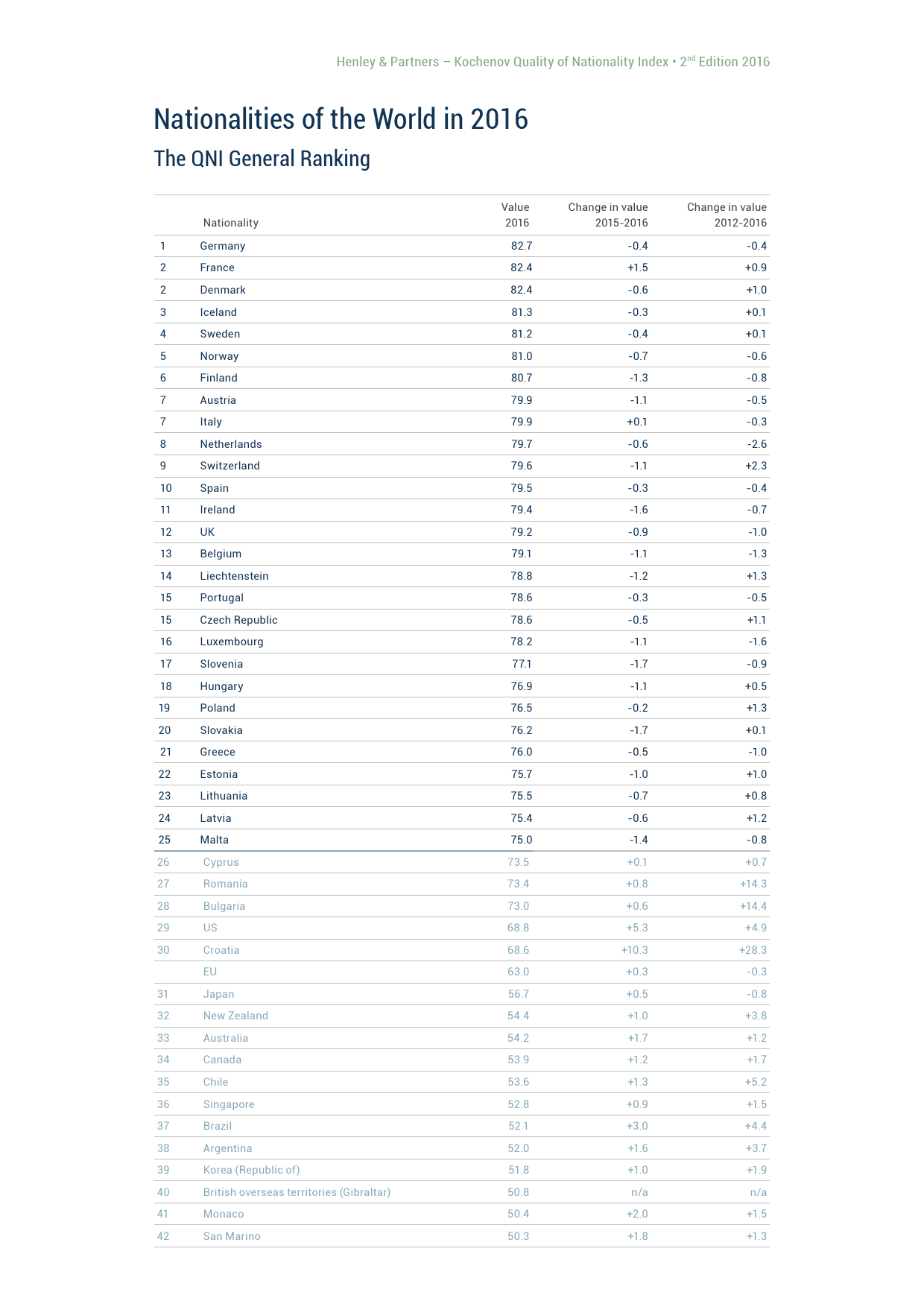 德国在2016 QNI参评国家中名列第一位。法国和丹麦并列第二,其后依次为冰岛、瑞典和挪威。