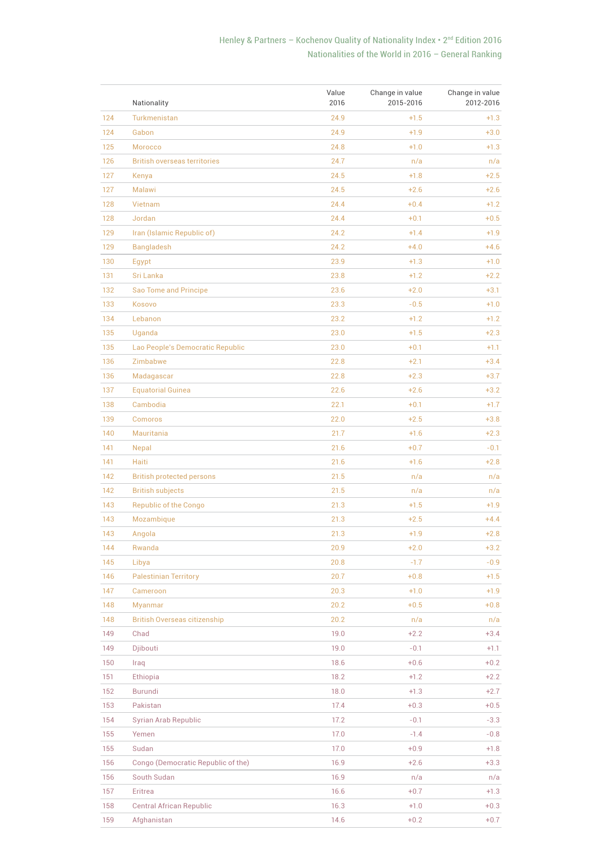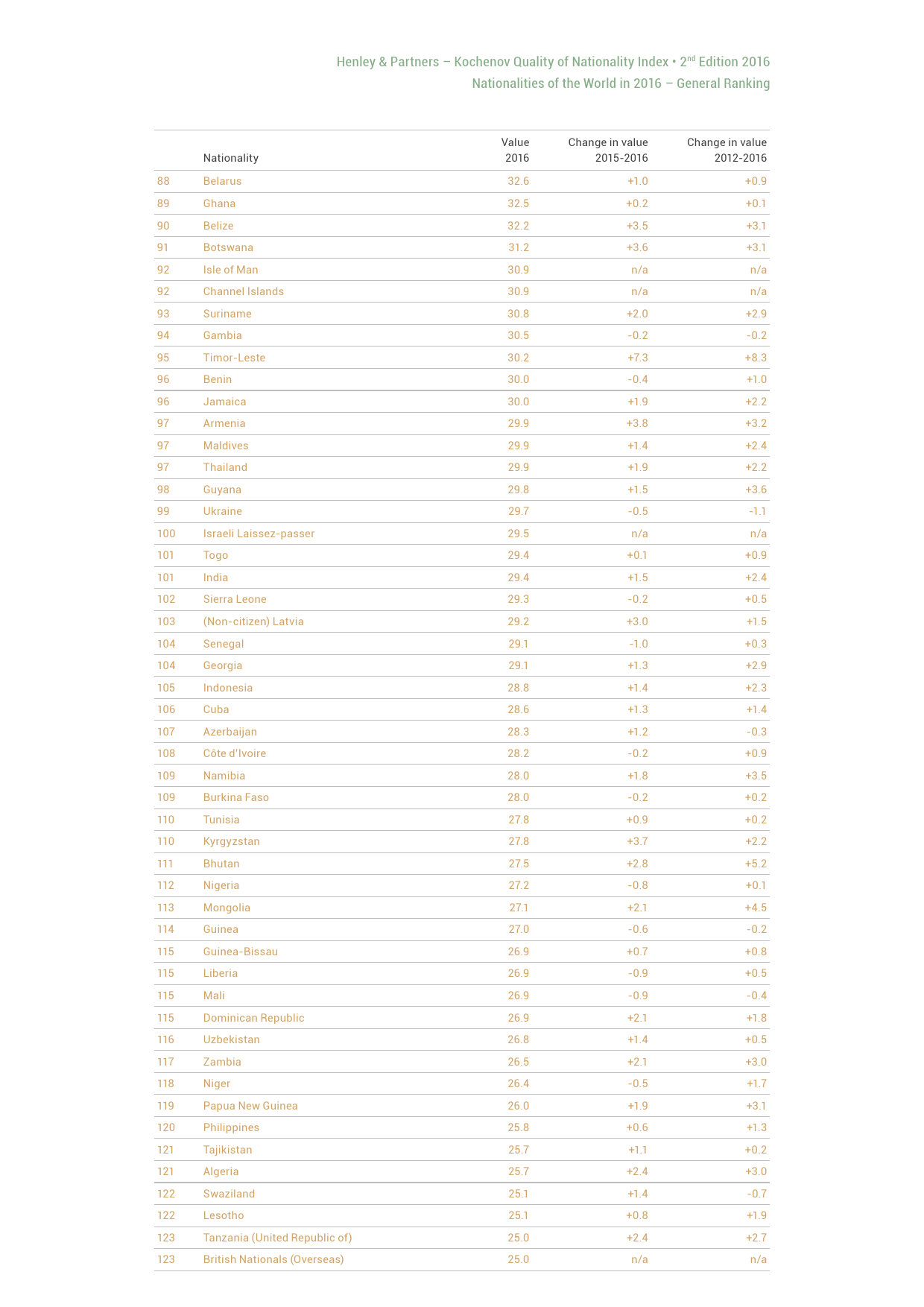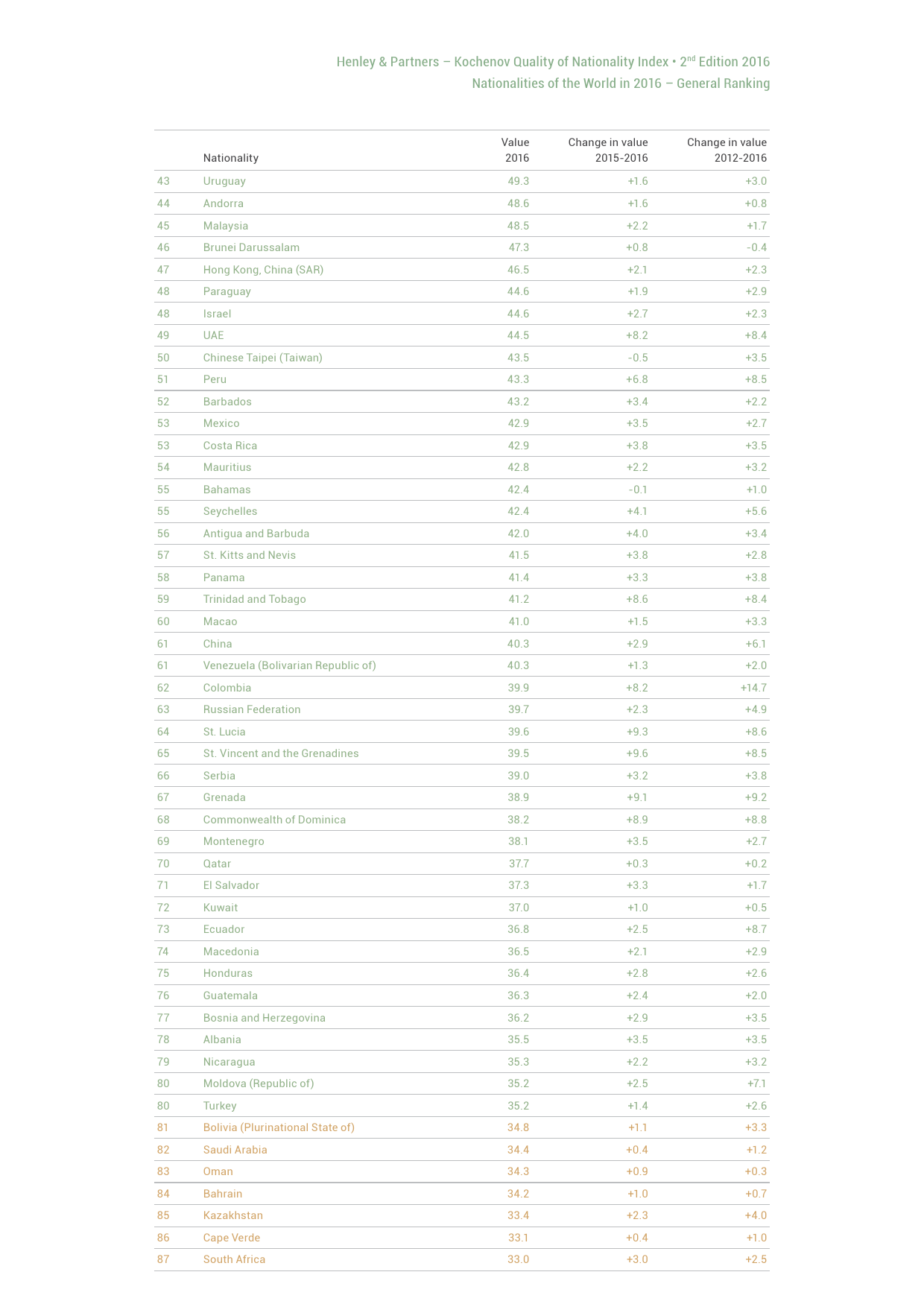 瑞士Henley & Partners咨询公司与合伙人科切诺夫教授发布的“2016国籍质量指数”报告(QNI)显示,参评国家中中国排名第61位,在金砖国家中位列第二。