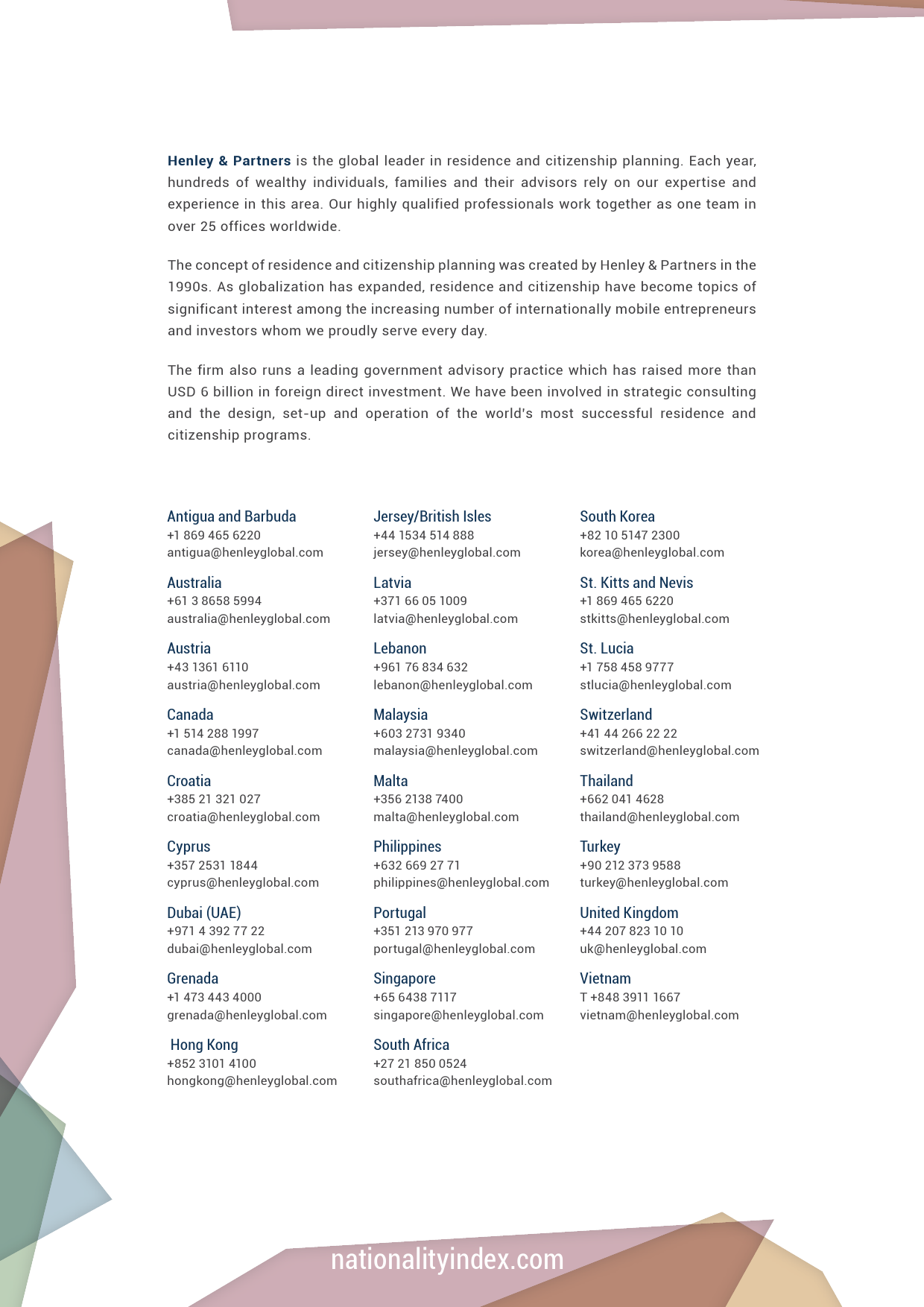 该项指数的制定分别参考了国家内外因素。内因包括经济规模、人类发展、社会秩序及稳定性;外因包括,临时出行免签权限及国外免签定居工作的可能性。
