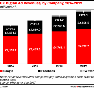 根据eMarketer对英国网络广告支出的最新预测,Google和Facebook将在未来几年内继续主宰英国网络广告市场。这两家科技公司合起来将占2017年英国网络广告收入的一半以上(54%),总计达63亿英镑(约合85亿美元)。