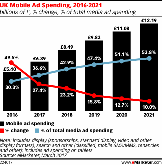 eMarketer预测,2017年英国网络广告支出将达到114.4亿英镑(154.4亿美元),比2016年上涨11.0%。移动继续推动网络广告支出增长。预计,今年英国移动广告支出将增长27.4%,占英国网络广告支出的36.6%。在移动广告中,视频是增长最快的类型,支出增幅47.7%。