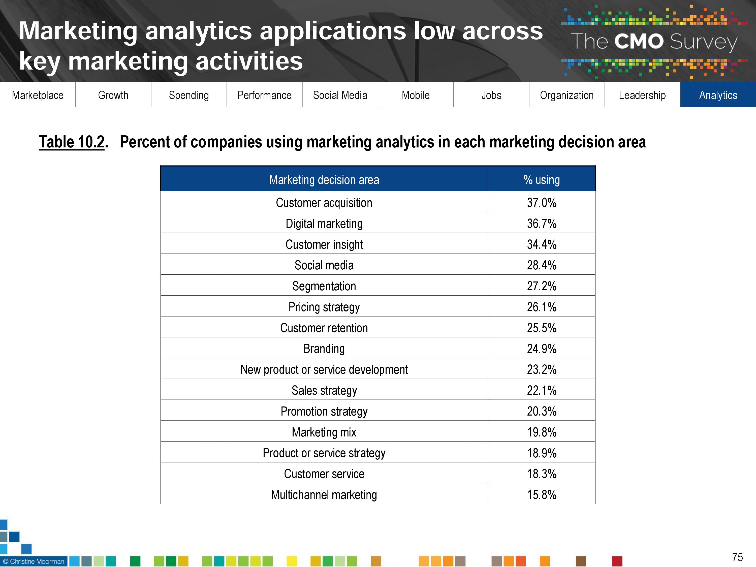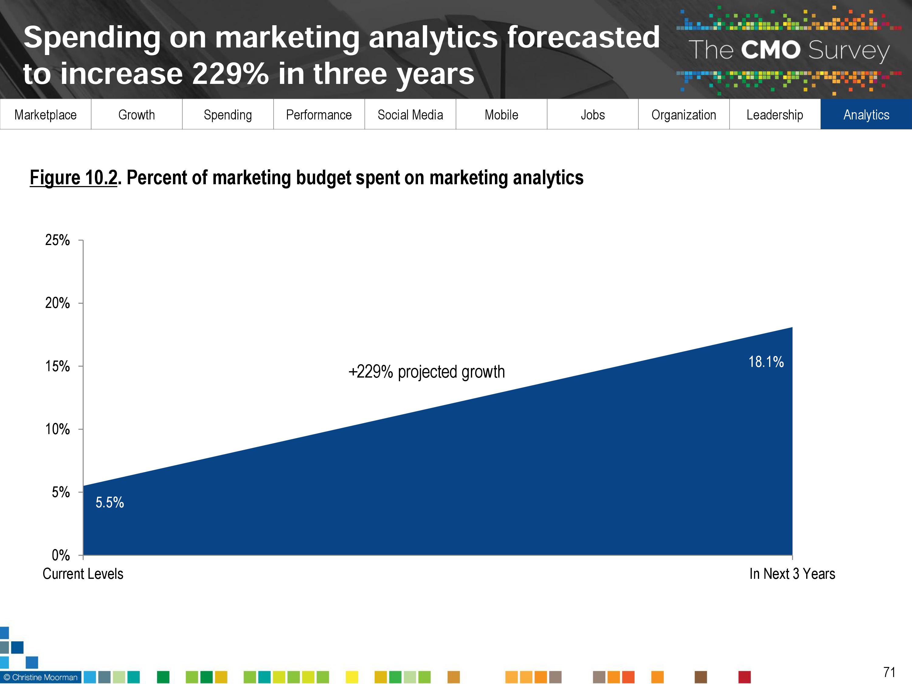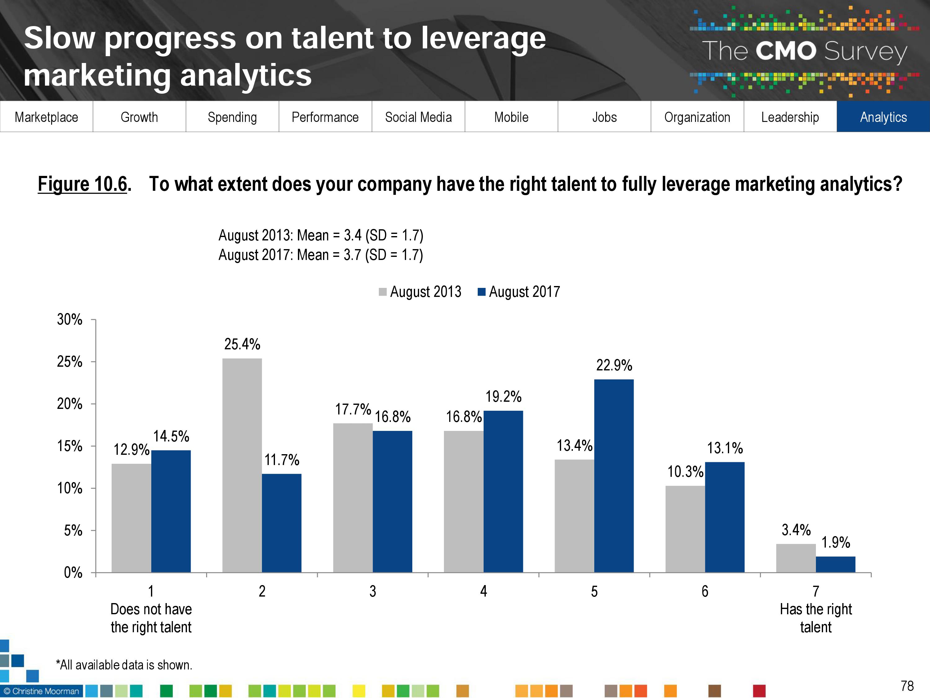 也许CMO认为掌握领导技能更重要,而了解和分析技术就交给专业人士。调查显示,CMO对利用适当的人才进行营销分析非常有信心,38%的CMO将其评前三等级(7分制),和2013年比增长11个百分点。
