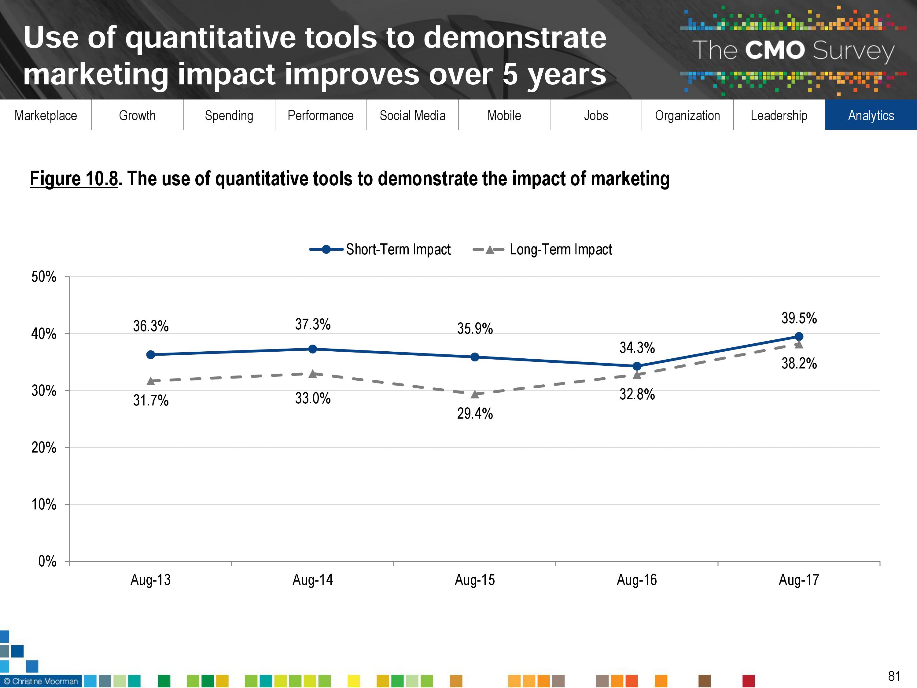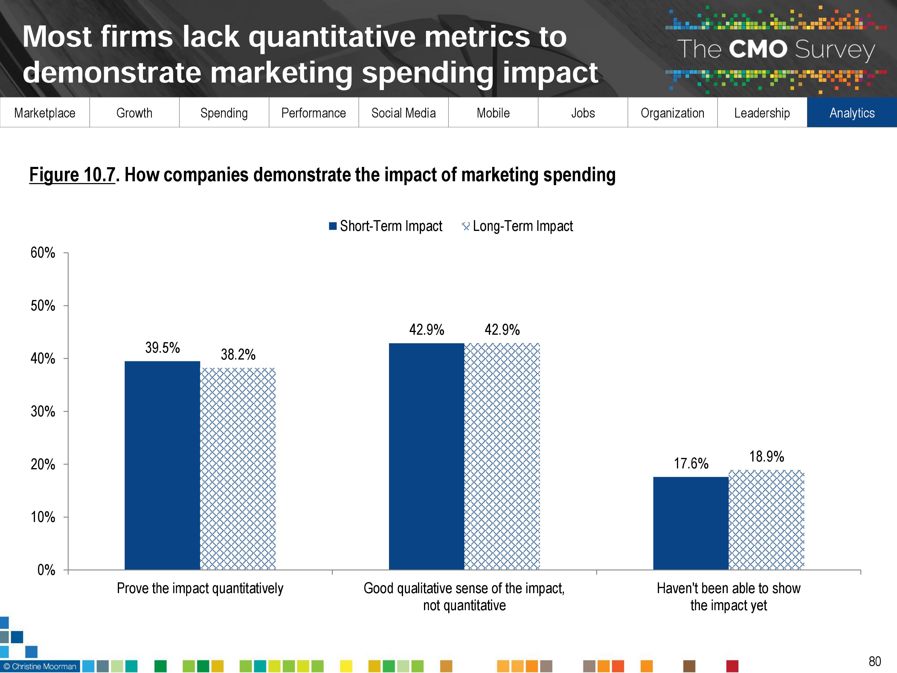 39.5%的CMO表示他们能证明营销支出的短期影响,和2013年8月的调查(36.3%)相比稍有增长。