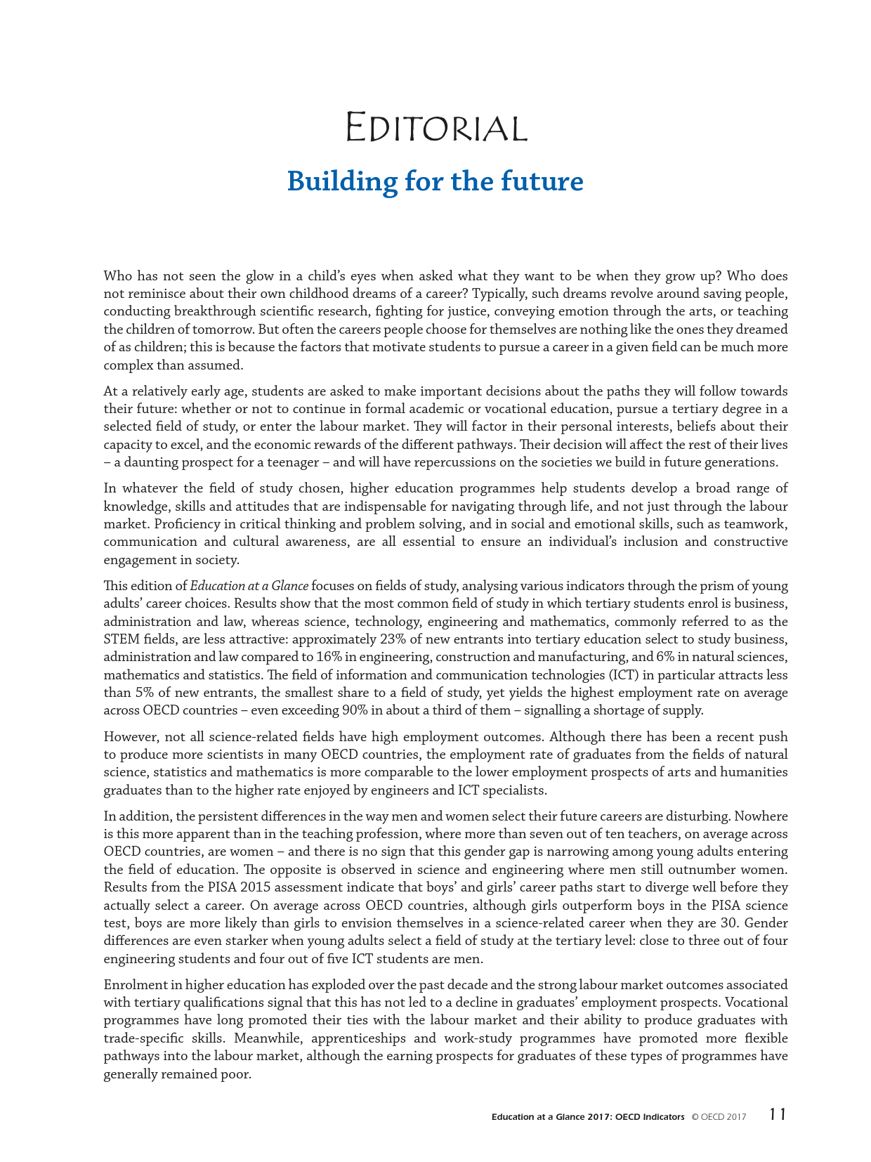 毕业生男女比例持平在某些专业依然是遥不可及的梦想,高级中等职业教育尤甚。高等教育阶段的男女比例失衡有所改善,但在工程、制造和建筑专业,新生仍仅有四分之一为女性。而在卫生和福利专业,女性接近新生总数的四分之三。在工商管理、法律、自然科学、数学和统计学等其他专业,新生男女比例已基本持平。