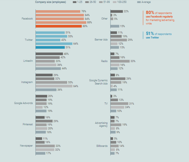 更昂贵的网络营销渠道小企业使用的比较少,例如Google的搜索营销工具AdWords和横幅广告。此外,还有少数受访者喜欢报纸、电视和广播等传统媒体。不到10%的小企业利用广告代理机构。
