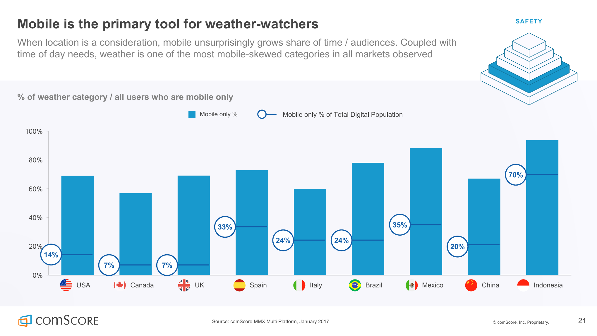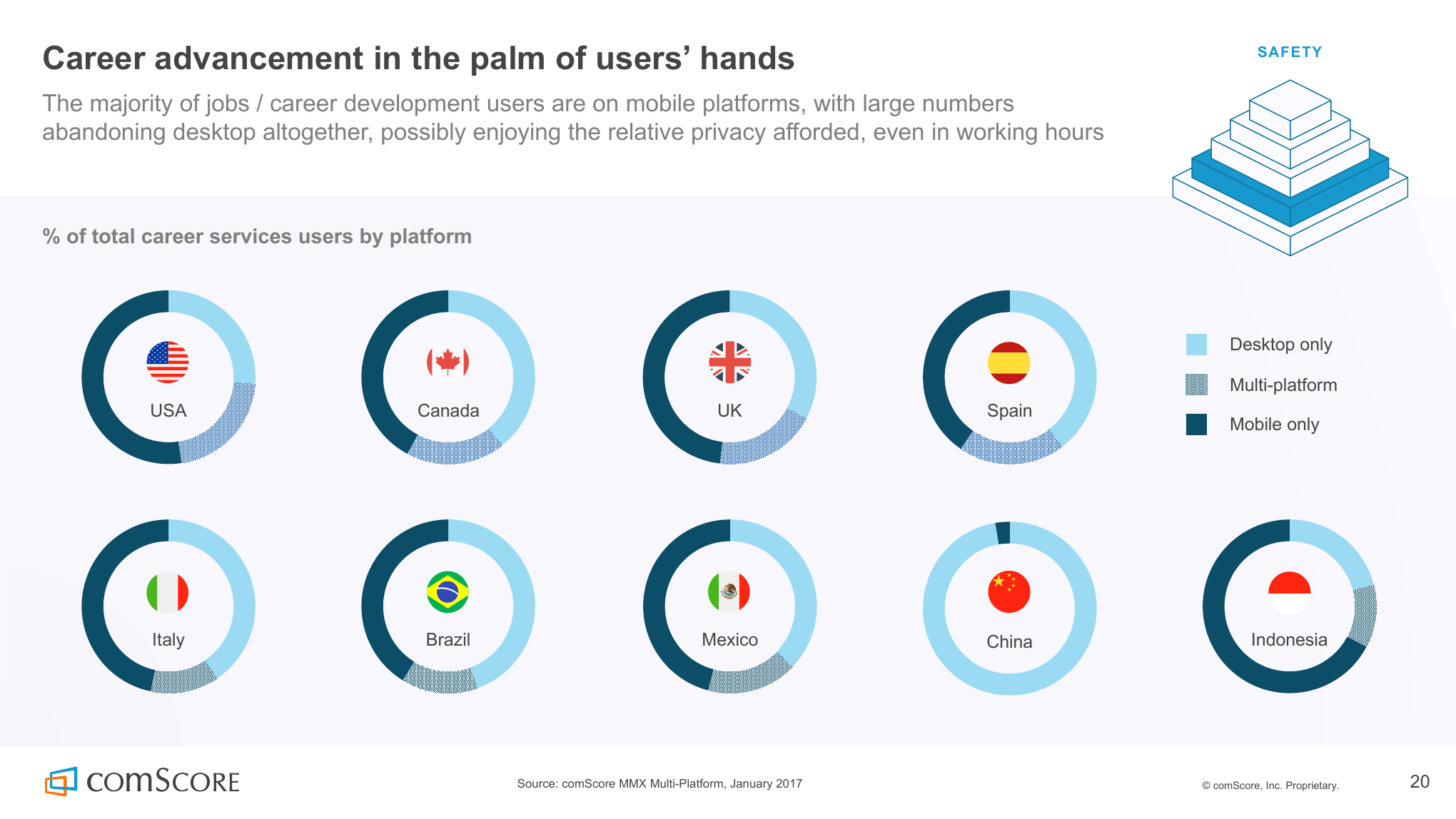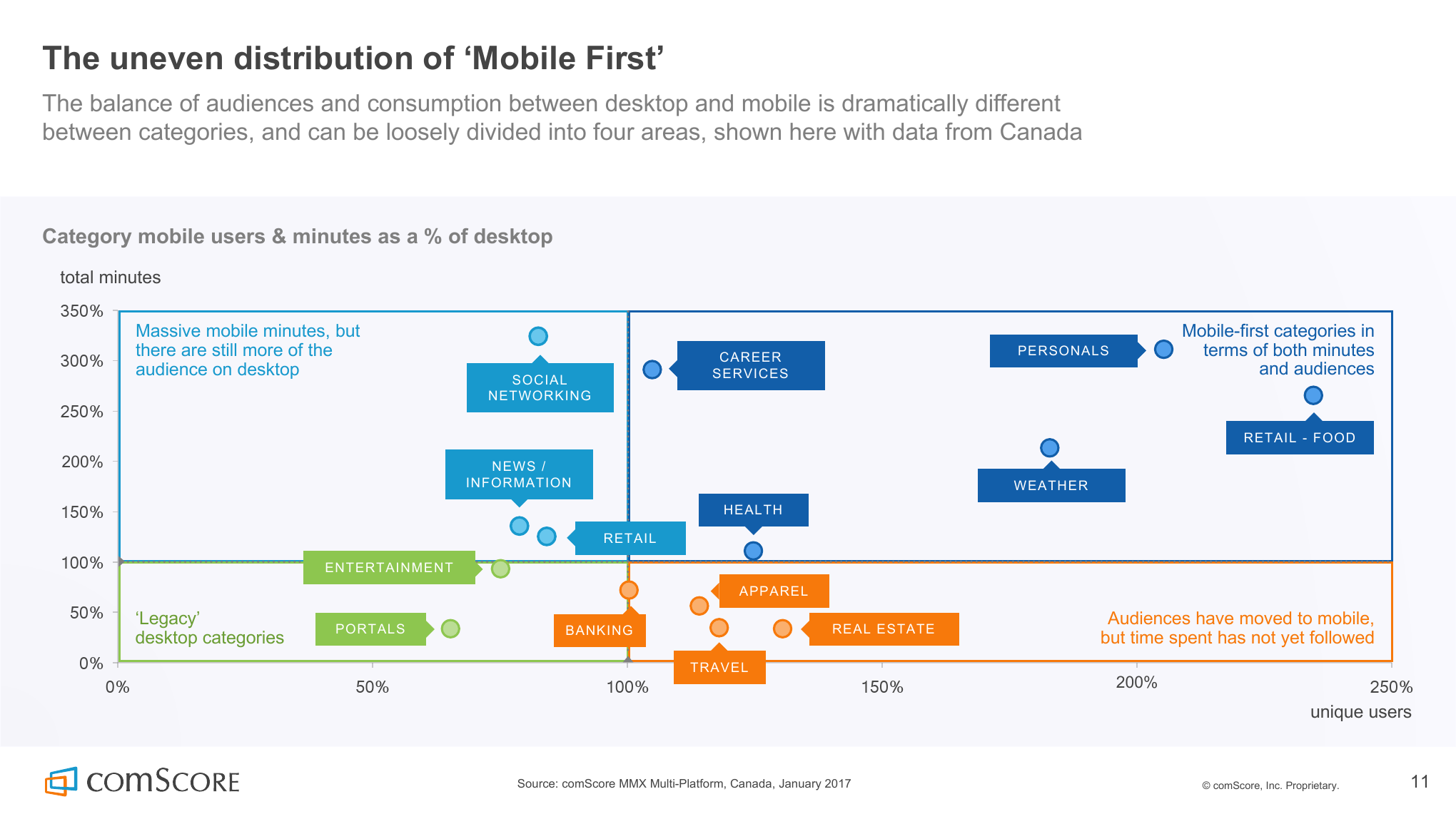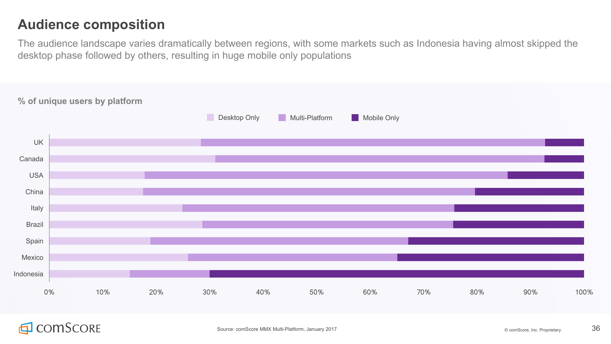 - 一般来说,处理封闭业务或位置敏感型服务时,仅使用移动设备的受众较多,而浏览零售及门户网站则仍有大量的桌面和跨平台受众。