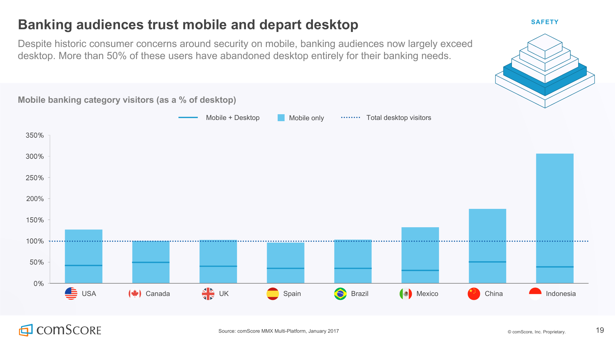 - 1/5的中国互联网用户每月仅通过移动设备上网,但在银行业类别中,移动受众的比例是桌面受众的两倍。