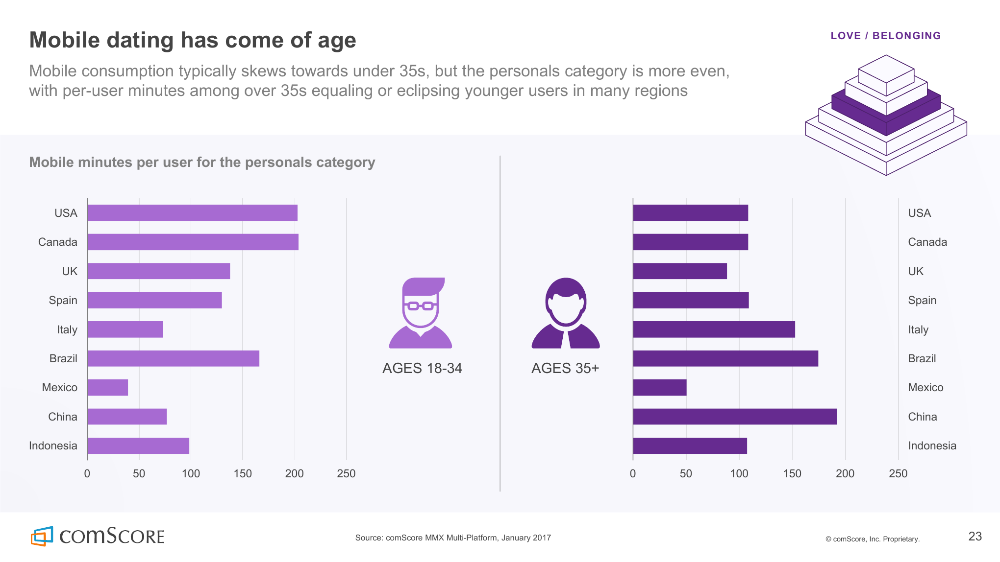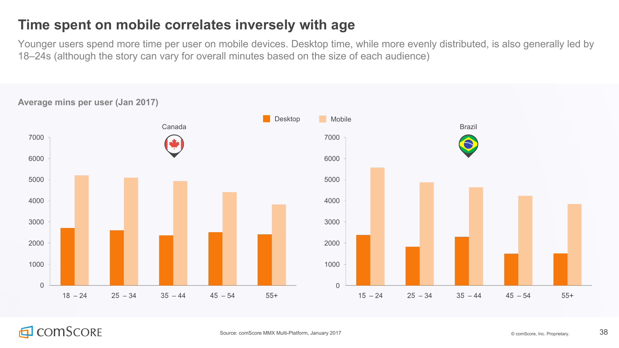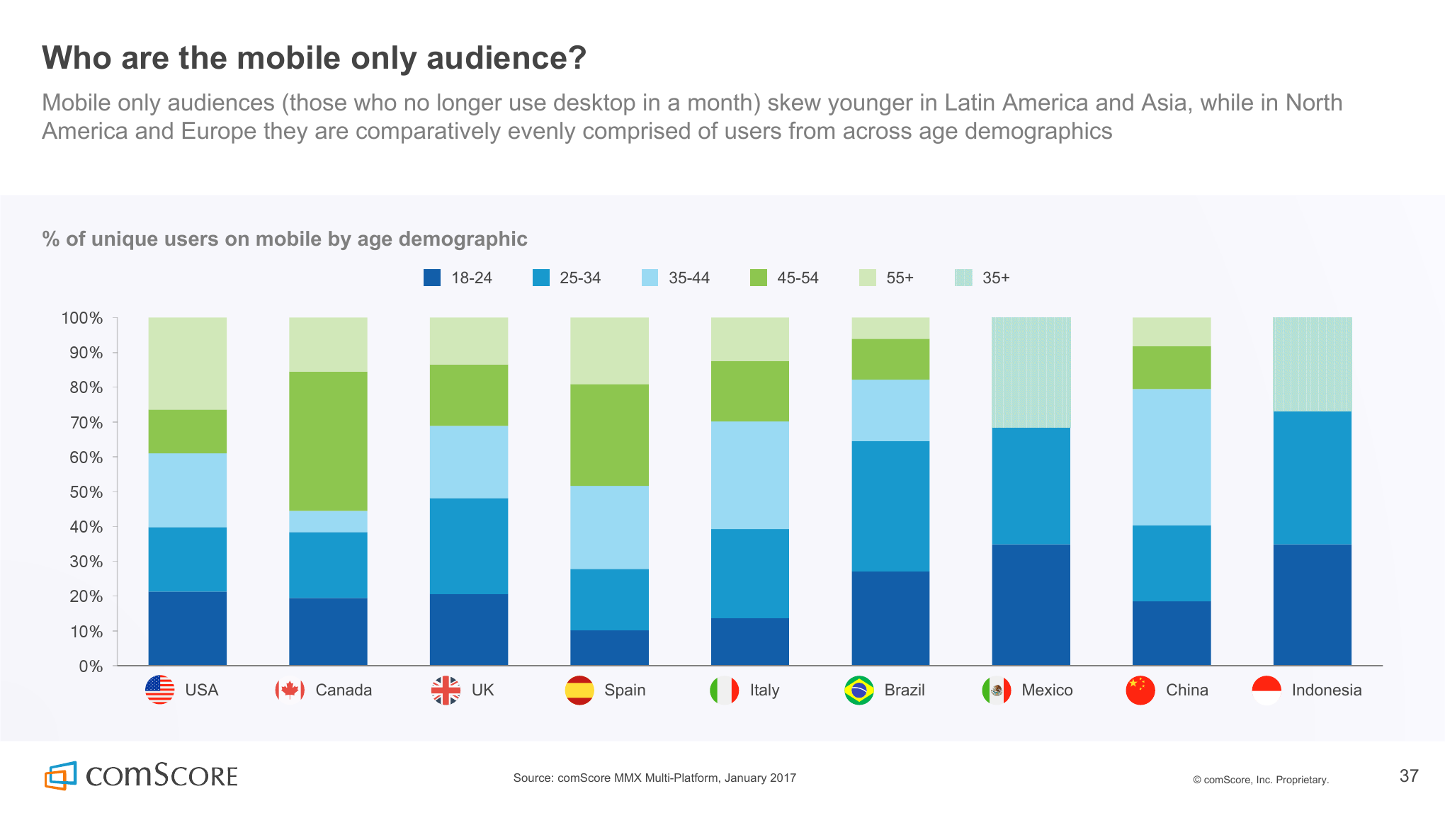 - 各年龄组中仅使用移动设备上网的情况差异很大,意味着广告商和媒体要触及其目标用户,就必须考虑平台组合。