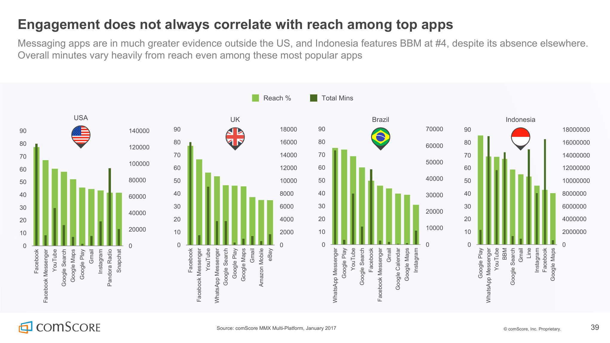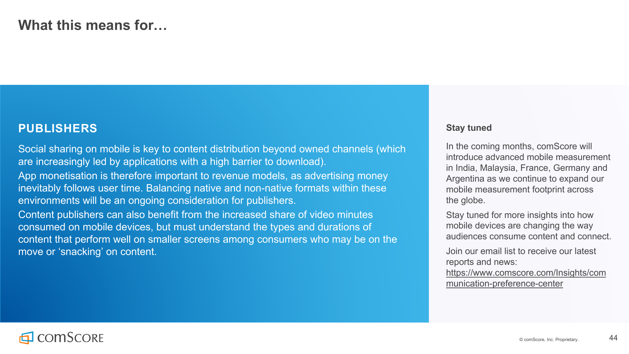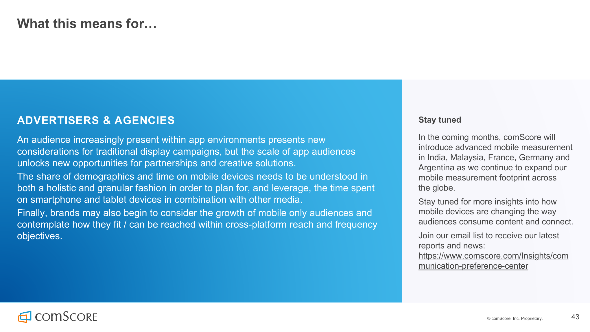 comScore和央视市场研究股份有限公司(CTR)最近宣布,通过引入CTR移动端消费者样本数据,在中国市场推出comScore MMX Multi-Platform和Mobile Metrix产品的重大升级版本。将安卓智能手机样本数据用于应用程序的监测,扩大了comScore对中国移动端受众的测量范围,提供了更全面的受众访问、互动及受众群体报告。通过对多平台及移动数据进行分析,我们得出了一些关键结论: