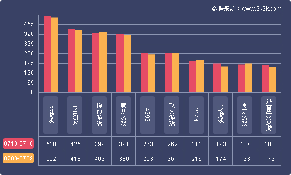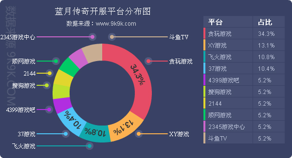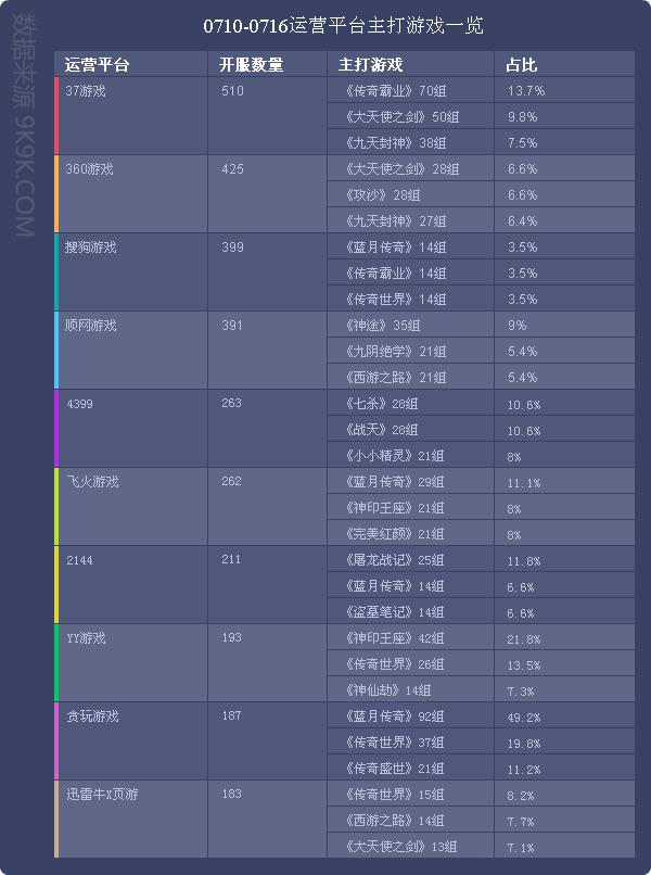 点评:本周各运营平台主打游戏开服情况变化不大,其中37游戏、360游戏均主推《九天封神》为主打游戏,开服占比7.5%、6.4%。贪玩游戏则以传奇类游戏为主要开服策略,其中主打游戏《蓝月传奇》开服占比近半。