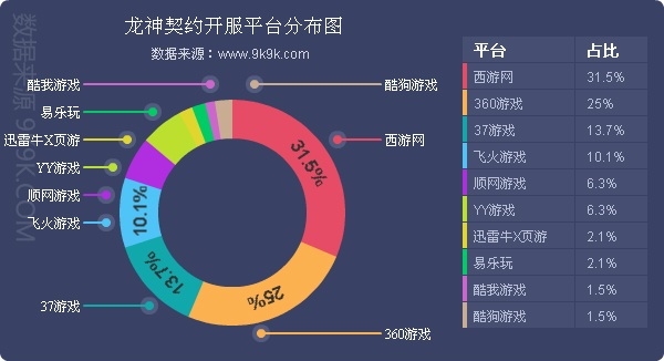 点评:本周《龙神契约》开服总数较上周略有减少,但整体开服趋势未发生变化。其在西游网开服占比降低至为31.5%。新增分布占比平台酷我游戏、酷狗游戏,日均开服频率均为1服/天。