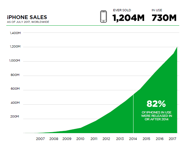 这意味着,过去十年苹果销售的iPhone中,2/3仍在使用中。虽然这个数字看起来很高,但是大部分正在使用的iPhone是过去四年销售的。