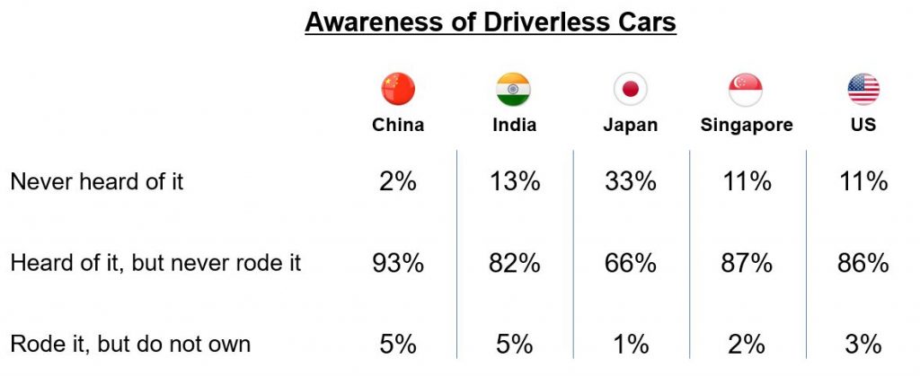 调查显示,中国、印度和新加坡等地消费者对无人驾驶汽车的认知水平与美国相似,近90%以上消费者至少听说过这种技术。日本人对此知之甚少,2/3的消费者曾听说过无人驾驶汽车。
