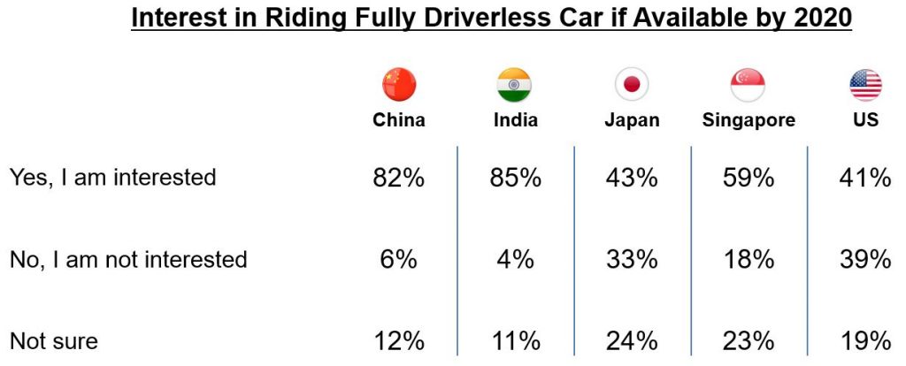 AIP调查了中国、印度、日本、新加坡和美国消费者对自动驾驶的认知和兴趣。