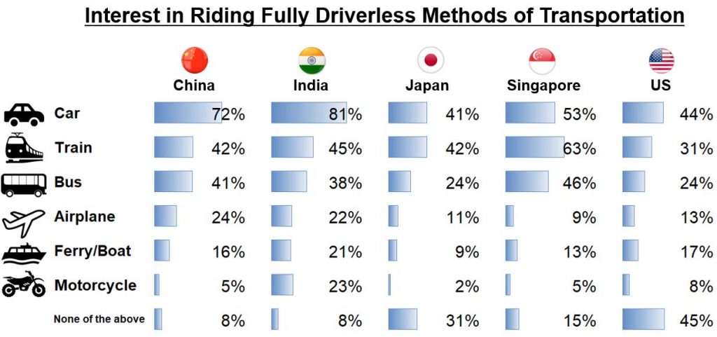 中国和印度消费者最容易接受无人驾驶汽车,其次是火车和公共汽车;