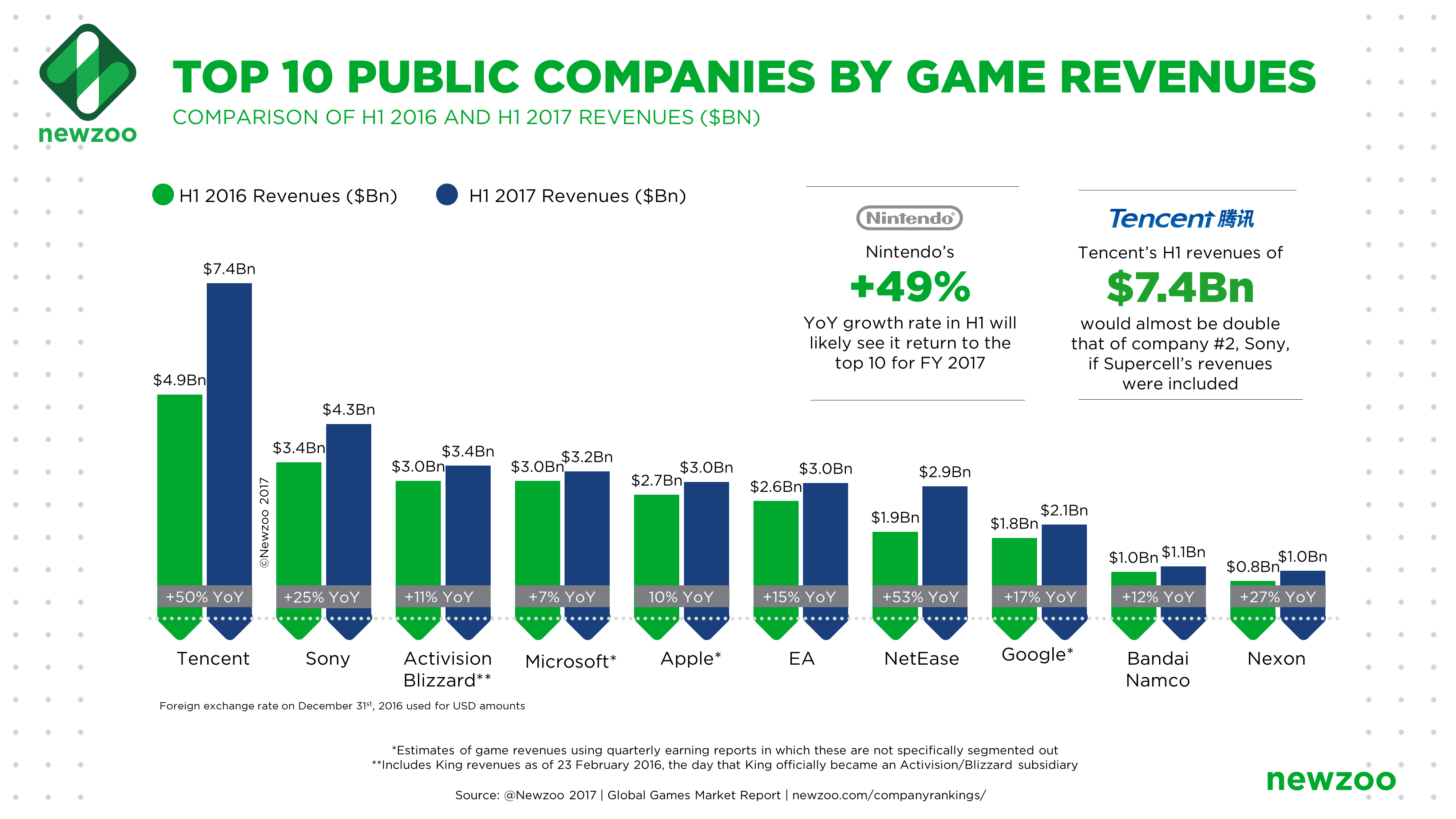 网易是另一家在中国快速增长的游戏企业,2017年上半年增长53%。因此,网易成为今年游戏企业前五名有力竞争者。