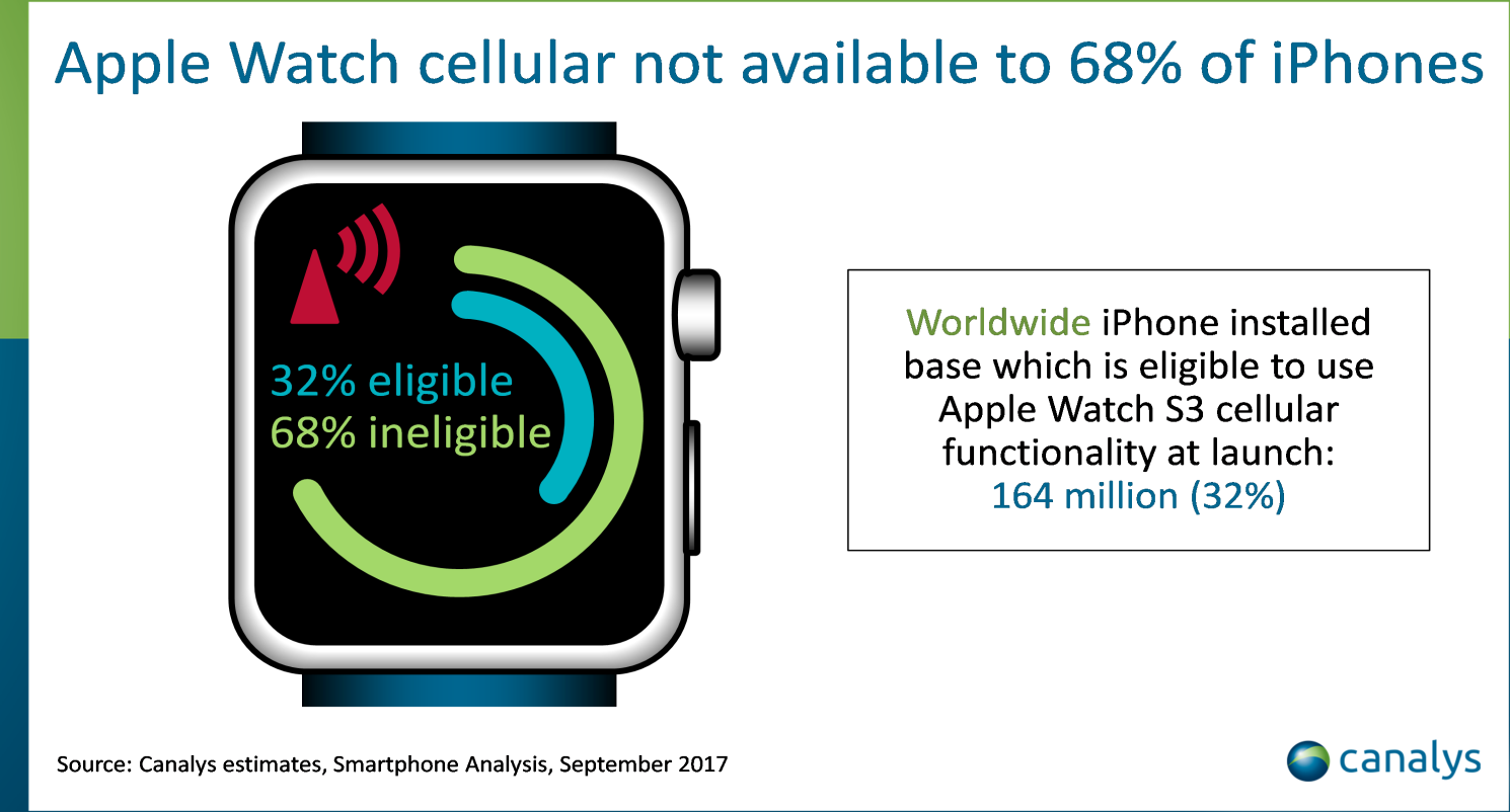 目前,全球共有5.17亿部iPhone在使用中,其中只有1.64亿符合Apple Watch 3的新功能所需条件。