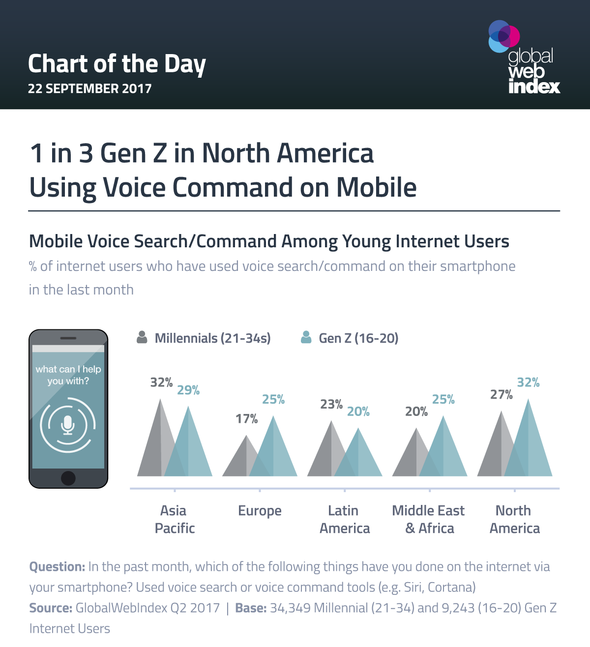 值得注意的是,语音助手普及率最高的是亚太地区。32%的千禧一代和29%的Z世代智能手机用户频繁使用语音助手。