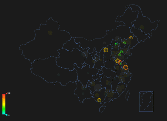 实时监控是广告投放监控最理想的状态。在数据可视化中,应用较多的是以区域为纬度的实时动态展示。就曝光来说,在一张地图中展示各地区的实时曝光情况,能够实时对比广告在不同地区的投放效果。当然,在实现数据搜集和处理的基础上,除了区域这一维度之外,数据可视化还能实现其它纬度的定制化广告投放实时监控。