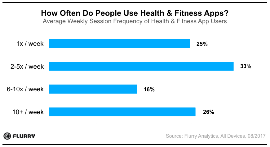 超过75%的活跃用户每周至少打开两次健康和健身应用程序。 此外,健康应用程序成瘾者的百分比非常高:超过25%的用户每周访问健身应用程序超过10次。 因此,这种使用频率推动了整体类别的参与度。 对应用程序开发人员来说,这是一个有吸引力的机会,以利用用户频繁的参与提升营利。