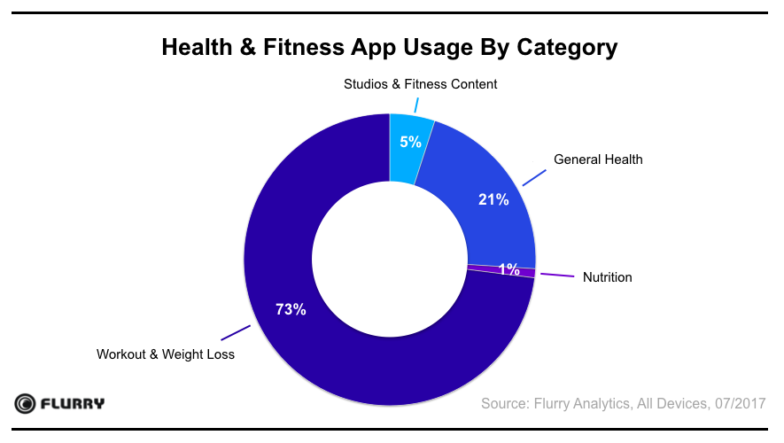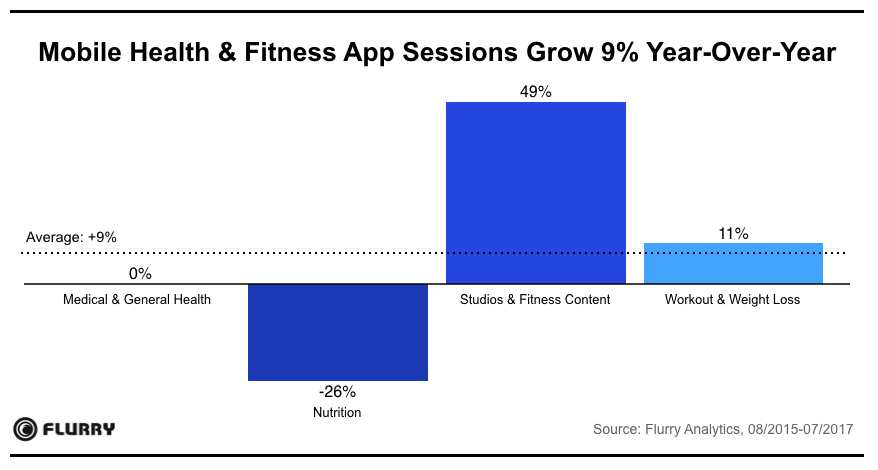最大的子类别——体育锻炼和减肥类应用的增长速度明显慢于上一年,增长率从2015年的67%下降到2016年的11%。另一个主要的子类别,一般健康状况追踪则在过去两年显示出停滞不前的状态。去年,营养类应用使用量有所下降,但是,工作室和健身内容应用仍增长了49%。