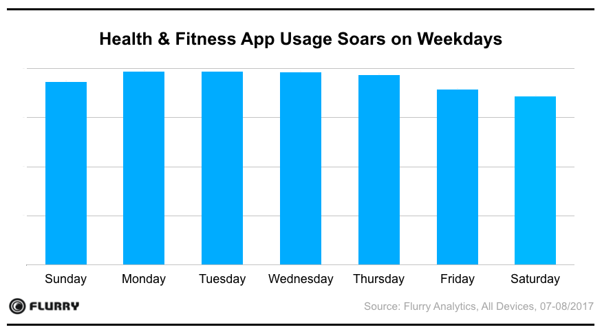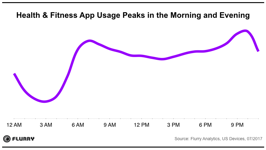 Flurry的数据显示,健康和健身应用程序的使用在早晨和晚上达到顶峰。健身房最繁忙的时间为上午9点至11点,下午5点至8点。但是,健身应用使用高峰则在晚上10点左右。