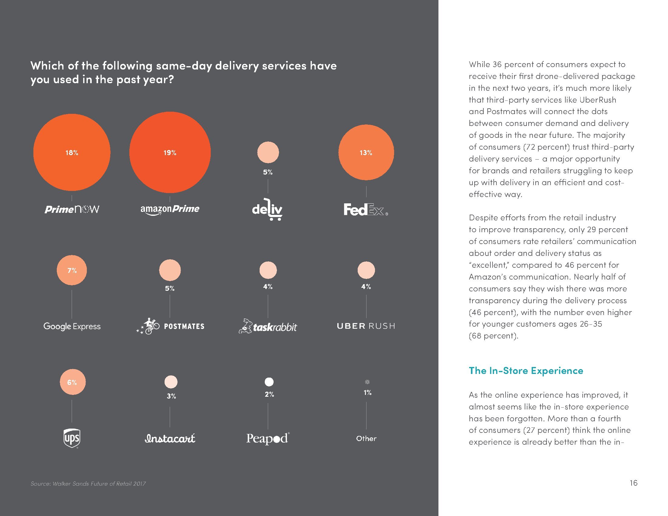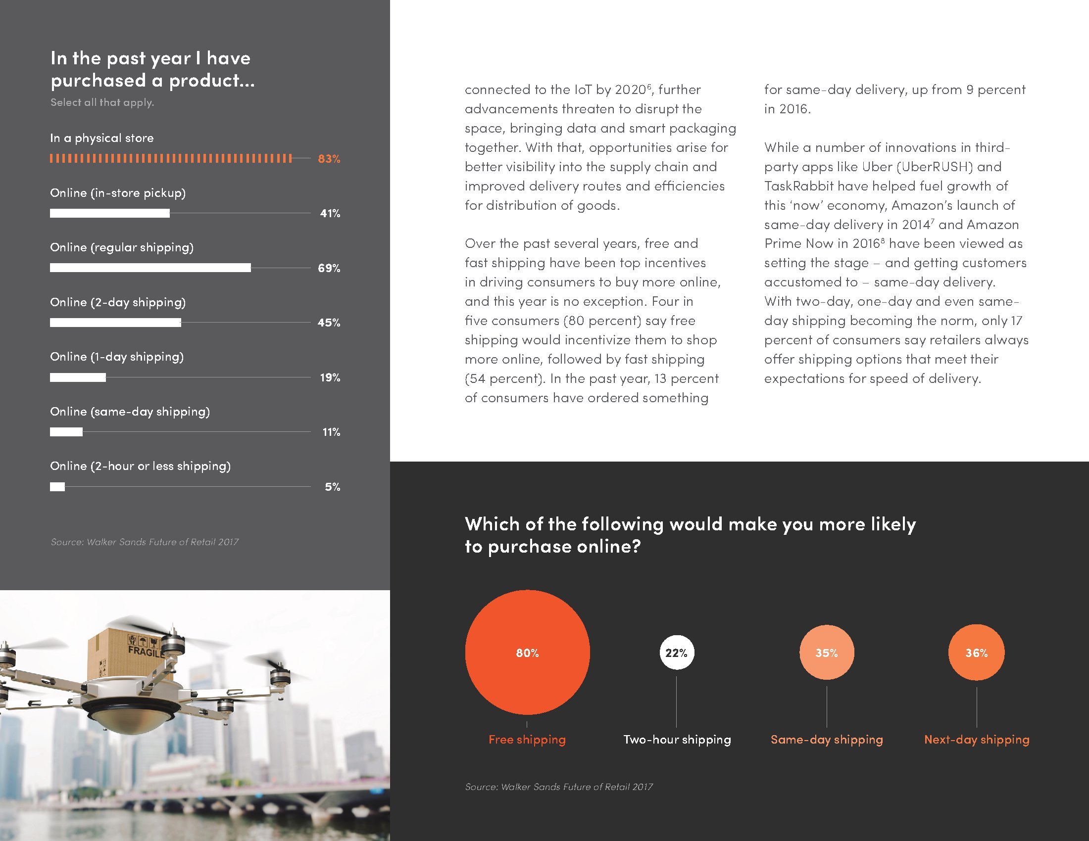 免邮费(80%)和快速发货(54%)仍然最能鼓励消费者网络购物。去年,13%的消费者购买过同日交付的商品,上升9%。