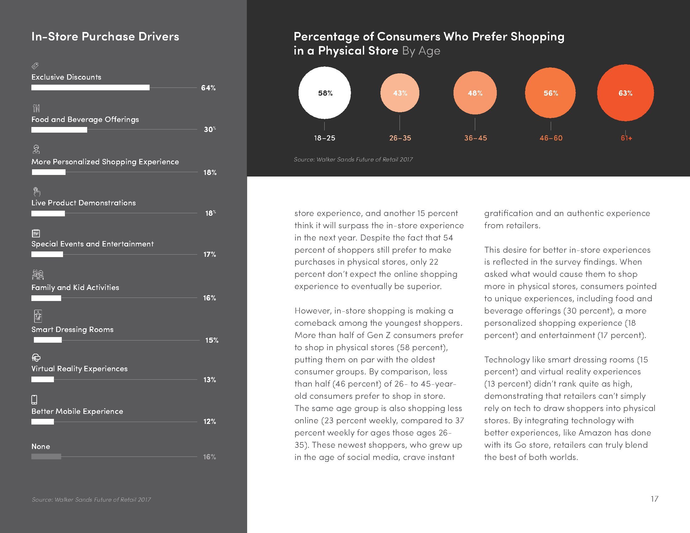 除了折扣,消费者表示独特的体验能吸引他们去实体店购物,例如,提供食品和饮料(30%)、个性化体验(18%)、产品示范(18%)和娱乐(17%)。智能更衣室(15%)、VR体验(13%)和移动体验(12%)反而没有那么有吸引力。